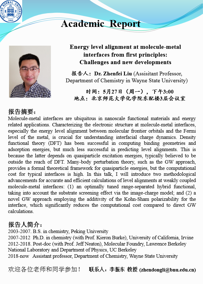 学术报告:Wayne State University,Dr. Zhenfei Liu,Energy level alignment at molecule-metal interfaces from first principles: Challenges and new developments