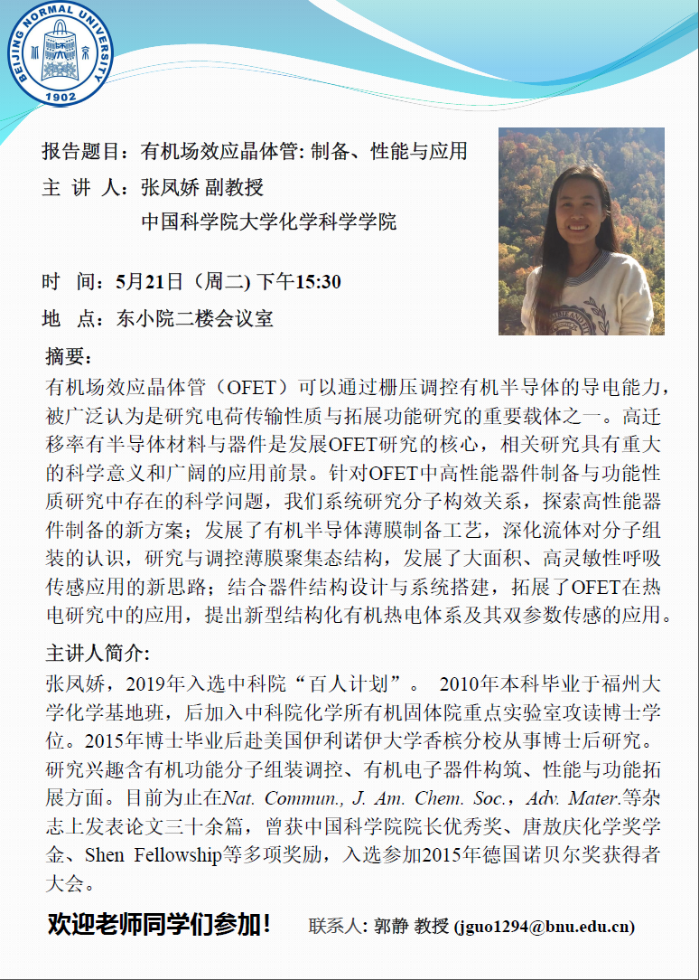 学术报告:中国科学院大学化学科学学院,张凤娇 副教授, 有机场效应晶体管:制备、性能与应用