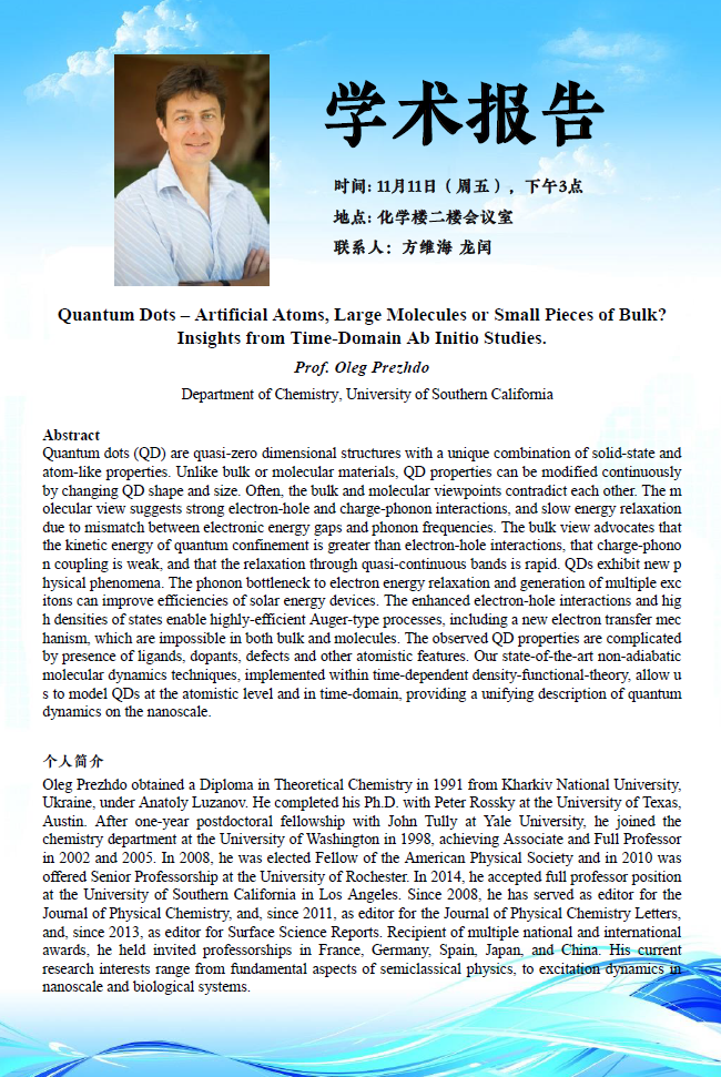 学术报告:University of Southern California Oleg Prezho教授,Quantum Dots – Artificial Atoms, Large Molecules or Small Pieces of Bulk? Insights from Time-Domain Ab Initio Studies.