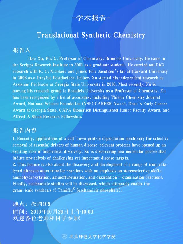 学术报告:Brandeis University,Prof.Hao Xu,Translational Synthetic Chemistry