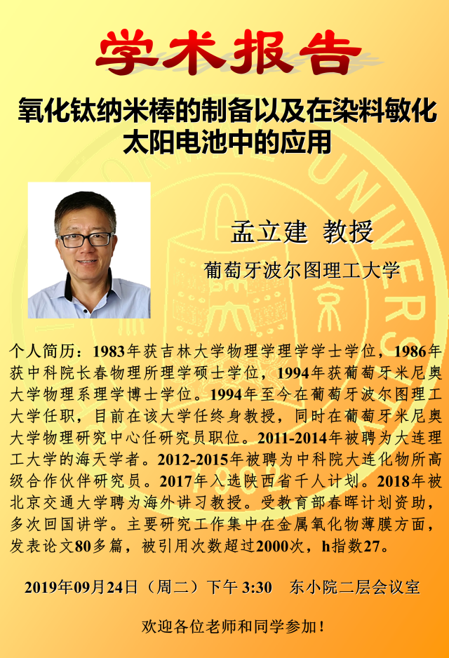 学术报告:葡萄牙波尔图理工大学,孟立建教授,氧化钛纳米棒的制备以及在染料敏化太阳电池中的应用