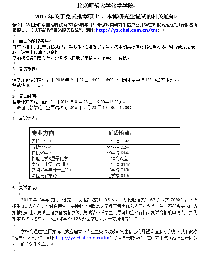 北京师范大学化学学院2017年关于免试推荐硕士 / 本博研究生复试的相关通知