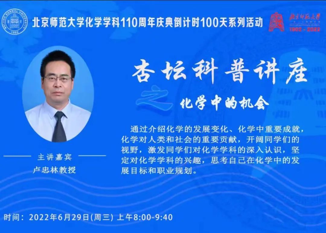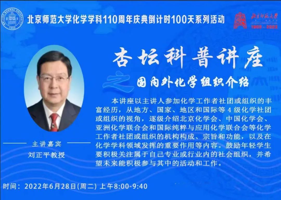 从2022年6月27日(周一)上午开始,将开展北京师范大学化学学科110周年庆倒计时100天系列活动中部分讲座的直播分享,欢迎感兴趣的老师、同学关注,上线观看。特别适合化学化工医药相关专业大一大二学生学习,热烈欢迎!