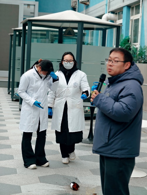 演练模拟了实验室中两名女生边走路边看手机、且未佩戴护目镜,导致意外碰撞,致使手中持有的二甲苯试剂瓶跌落破碎、试剂飞溅至眼部及皮肤并造成地面泄漏的紧急场景。演练现场,在事故发生后,楼层安全负责老师在接到学生情况汇报后迅速反应,第一时间断电、开启通风橱至最大风量、疏散人员并向学院及保卫处报告。随后,学院迅速启动应急预案,身着专业防护装备的应急处置小组携带吸附棉、警戒线、VOC检测仪等物资进入现场。