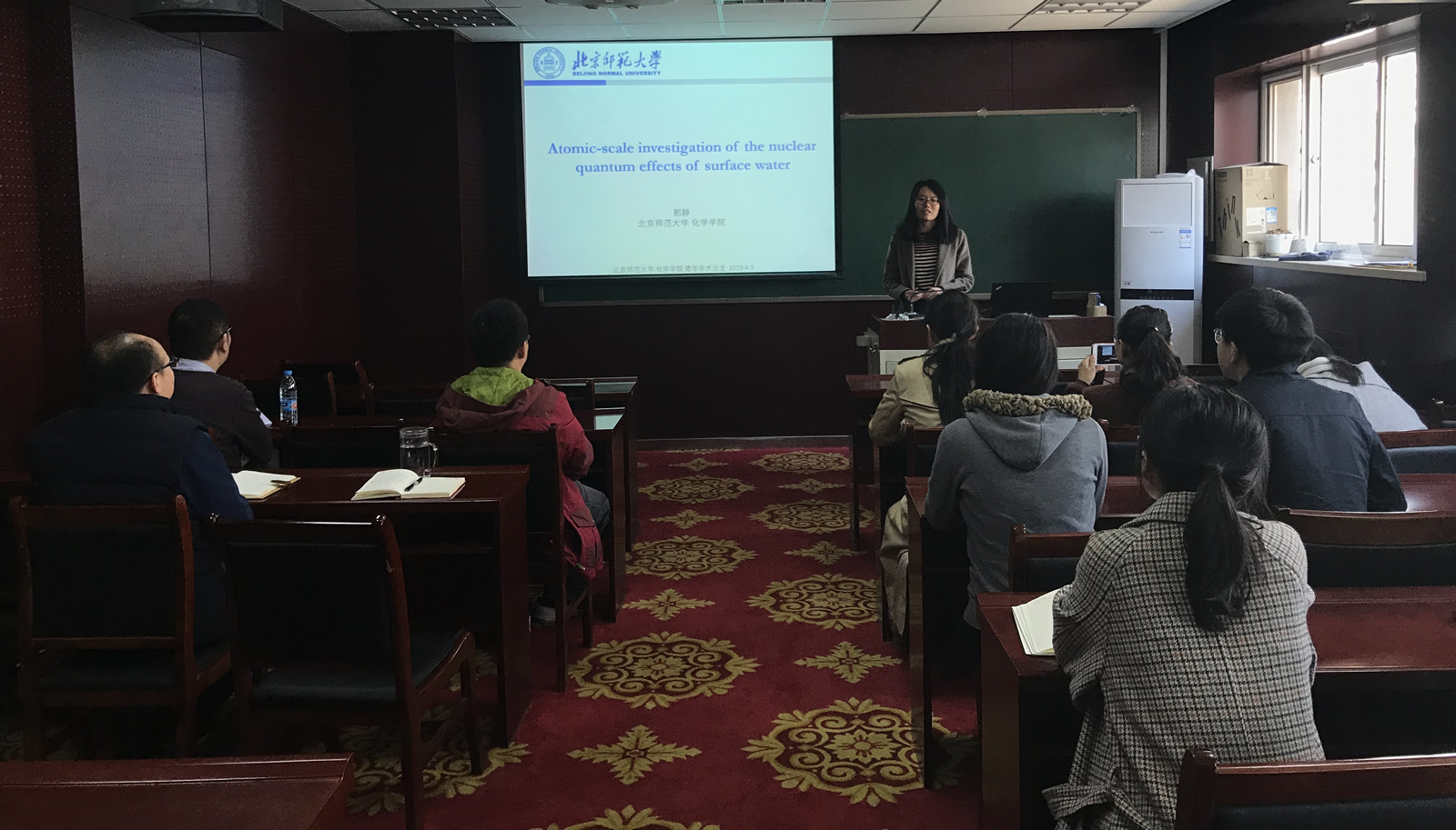 郭静教授2018年入职北京师范大学化学学院,主要从事基于扫描隧道显微镜/qPlus非接触式原子力显微镜的表面物理化学研究。近年来在尖端扫描探针技术的发展、表面水/冰的亚分子级分辨成像、质子转移动力学、核量子效应(量子隧穿和量子涨落)对水的氢键网络、氢键强度甚至表面异质催化的影响等方面取得一系列优秀的研究成果。郭静老师结合自身的科研经历,做了题为“Atomic-scale investigation of the nuclear quantum effects of surface water with STM/AFM”的主题报告,报告深入浅出、内容丰富而详实,引起了相关领域研究工作者和研究生的极大兴趣。随后,郭静老师与在座师生进行了热烈的讨论并就相关问题进行了深入的交流。