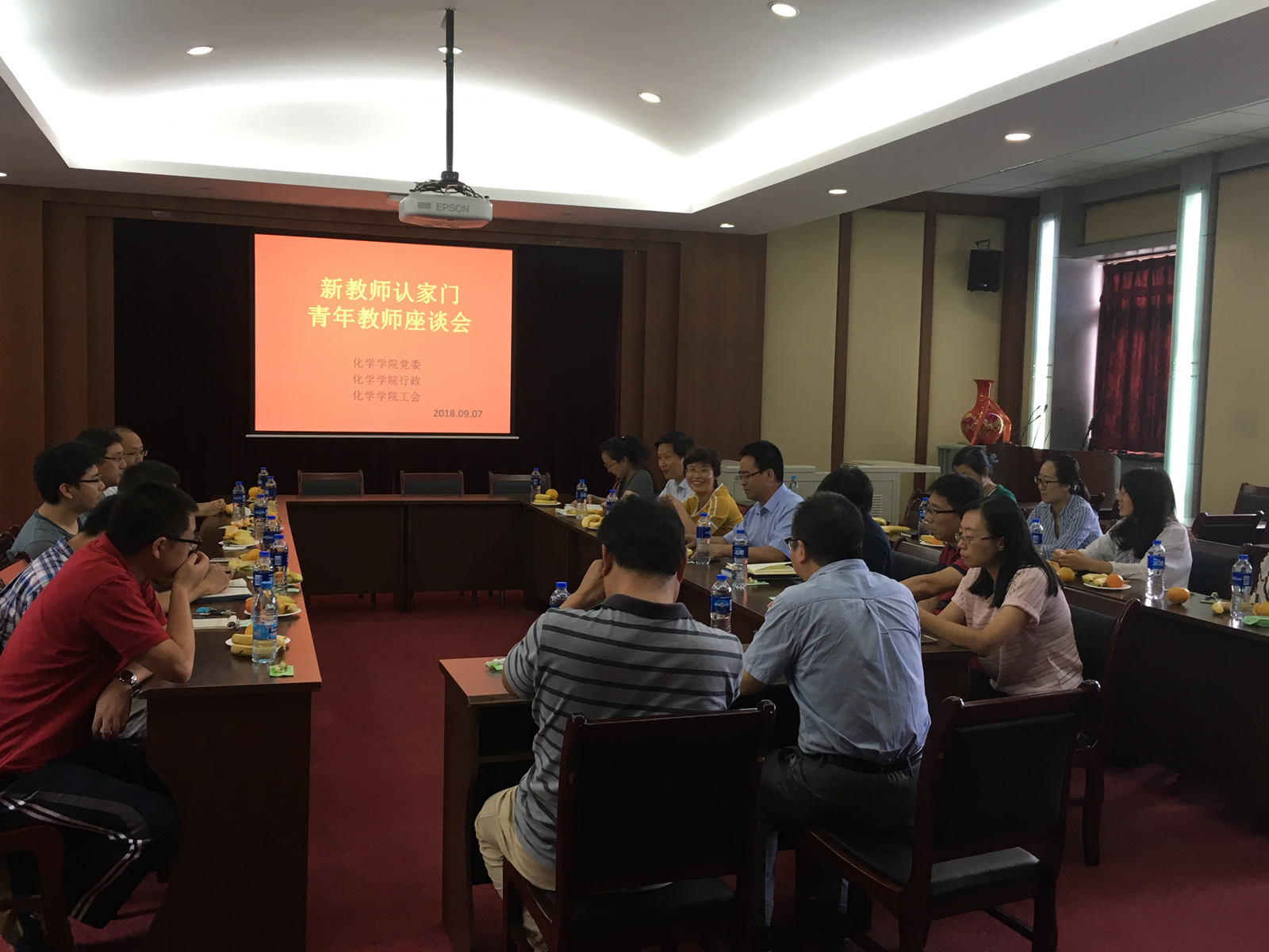 2018年9月8日下午,化学学院在二楼会议室举办了2018年新教师认家门活动暨青年教师座谈会,为学院和学科发展集思广益。化学学院分党委书记卢忠林、院长范楼珍、副院长杨清正、副院长魏朔副、副院长张俊波、院党分委副书记韩娟、院工会主席蒋福宾出席,学院的部分新教师代表和各学科青年教师20余位参会。