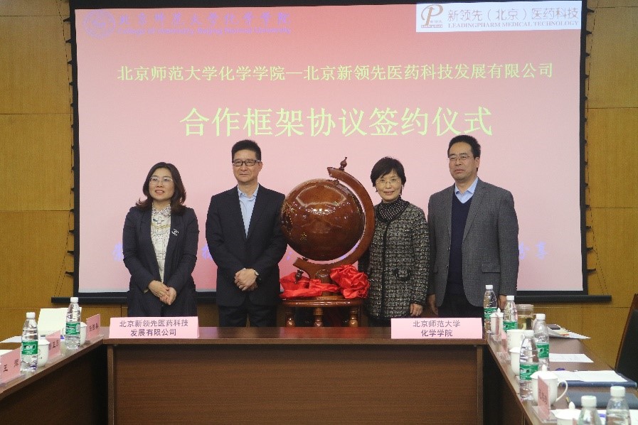 2021年4月14日下午,为了进一步促进产学研工作的顺利推进,北京师范大学化学学院与著名医药企业北京新领先医药科技发展有限公司正式签订战略合作框架协议。双方将以此协议为开端,充分发挥各自优势,深化校企合作,助推科研成果落地转化,实现校企双方优势互补、资源共享,促进产学研创新发展。新领先医药董事长陶新华先生、总裁高世静女士、总裁助理颜耀东等8位领导和主要负责人出席了此次签约仪式。北京师范大学化学学院党委书记卢忠林教授、院长范楼珍教授、副院长杨清正教授、副院长张俊波教授及各位教师代表也出席了此次仪式。