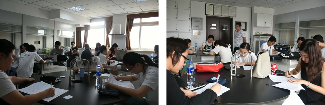 上午9:00至11:00为笔试环节,比赛选手们在化学楼606和608答题。笔试部分主要考察实验基本技能和基本操作的理论知识,实验室安全常识等内容对参赛选手进行全面的检测。