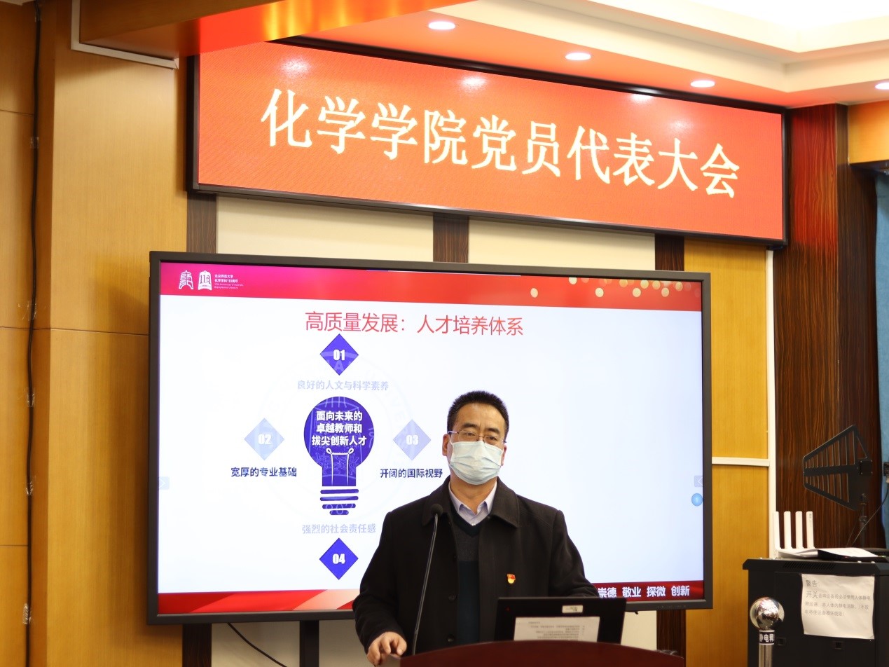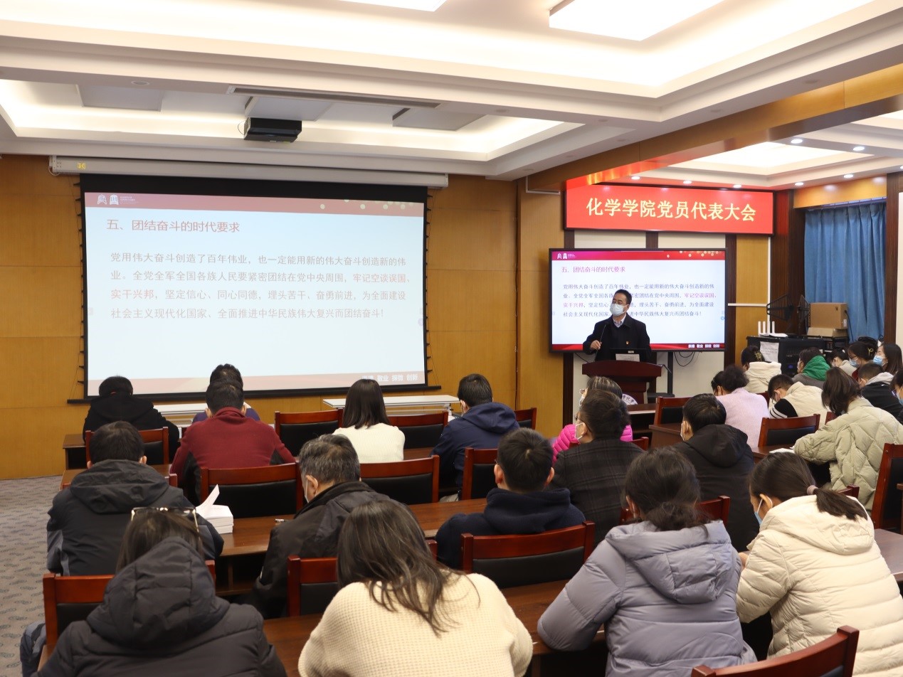 11月4日,在全校深入学习贯彻党的二十大精神的浓厚氛围中,化学学院党委书记卢忠林教授在全院党员代表大会上作了题为“领悟新时代宣言,砥砺大使命目标”的辅导报告,持续推动学院师生学习宣传贯彻党的二十大精神。100余名师生党员代表线下参会 。