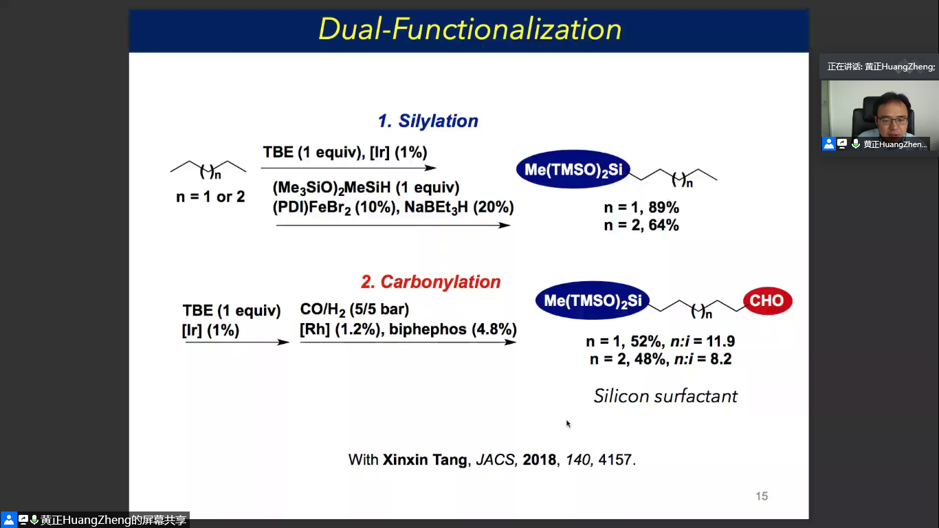 首先,在烷烃官能化部分,黄正研究员指出:重点就是寻找理想的温和及选择性的均相催化剂体系,所以他的课题组设计了目前报道的活性最强的烷烃脱氢催化剂PSCOP-Ir催化剂,并对一系列C、N、O、S(Linkers)连接的催化剂的电子结构和催化活性进行了研究,还采用了双金属催化剂策略进行末端选择性烷烃官能化,包括烷烃的硅基化、羰基化和胺甲基化等。