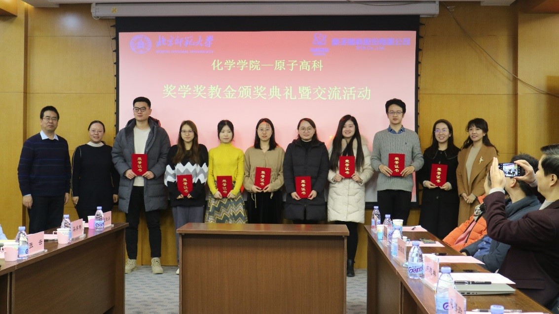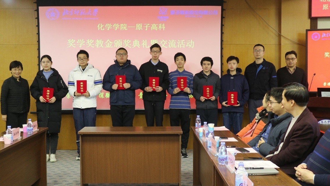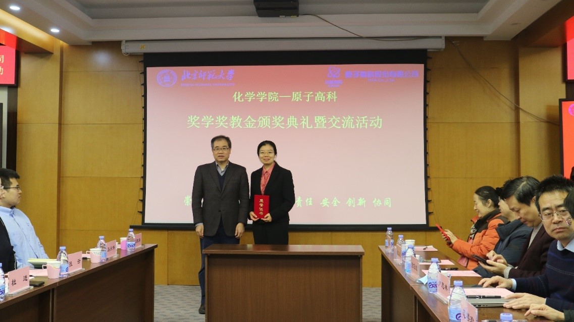 2021年12月28日上午,中国同辐原子高科股份有限公司杜进董事长、隋艳颖副总经理等一行7人莅临化学学院,参加化学学院原子高科奖学奖教金颁奖典礼和学术交流活动,活动共分为两个阶段,由学院党委副书记韩娟和副院长张俊波分别主持,活动在化学楼二楼会议室举行。化学学院党委书记卢忠林、院长范楼珍等热情接待了原子高科股份有限公司的领导和专家,并参加了上述活动。