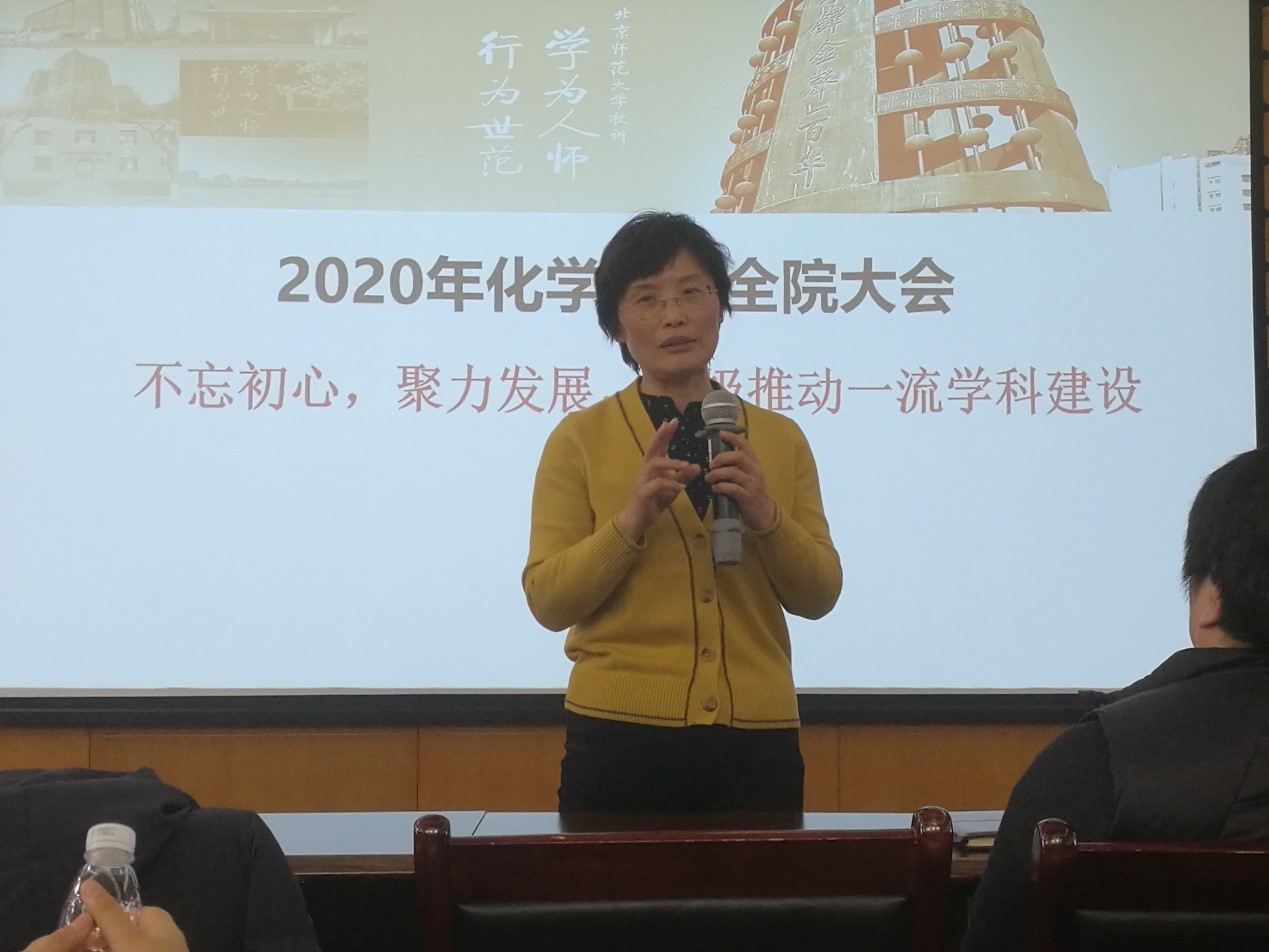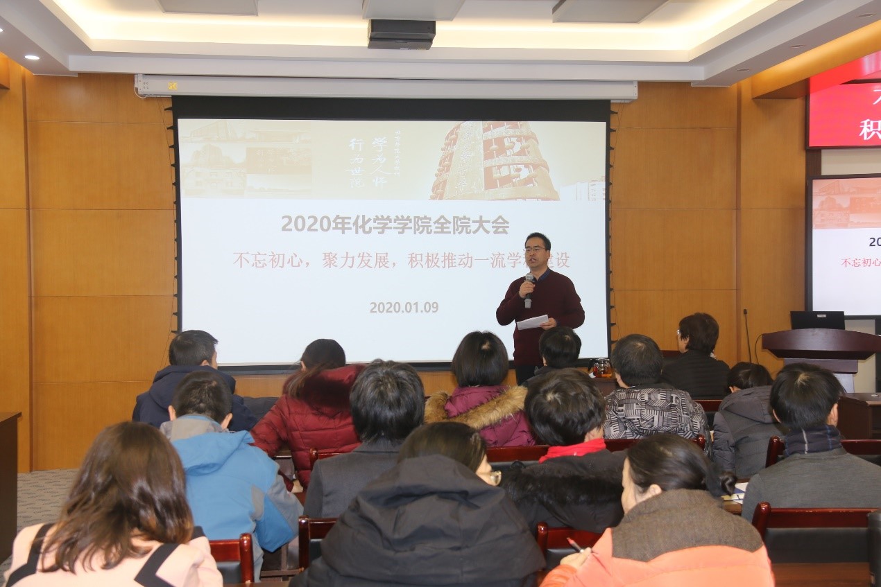 2020年1月9日,化学学院在化学楼二楼会议室召开了全院大会,会议主题是:不忘初心,聚力发展,积极推动一流学科建设。会议共分为4个阶段,由化学学院党委书记卢忠林老师和院长范楼珍老师主持,化学学院在校的教职工近百人参加了大会。