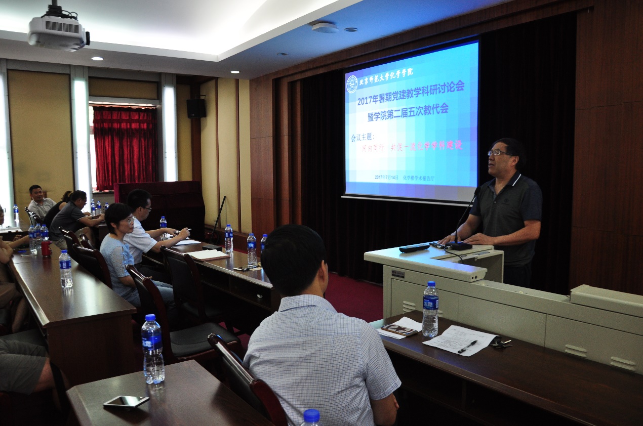 2017年7月15日上午,化学学院在化学楼二楼会议室召开了主题为“同向同行 共促一流化学学科建设”的暑期研讨会暨学院第二届五次教代会。除了特殊情况请假外,化学学院教职员工共计101人参加了2017年度关于党建、教学、科研和学科发展的大会。