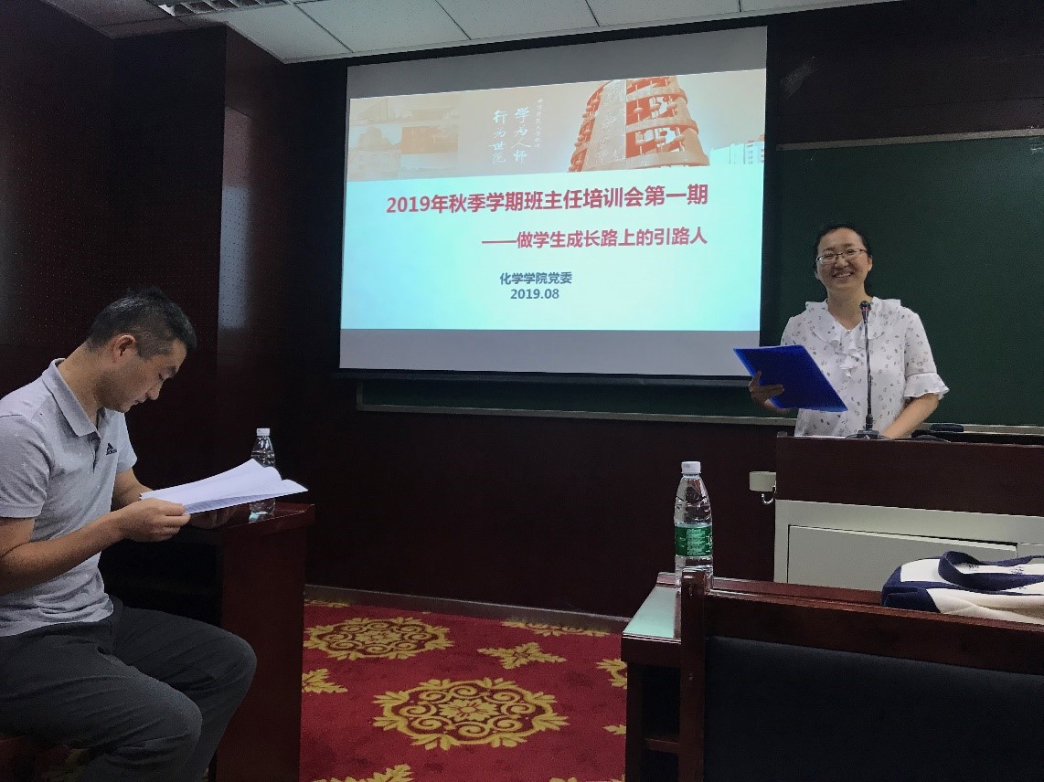 为全面落实全国教育大会、全国高校思想政治工作会议精神,建设高质量、高水准的班主任队伍,促进班主任老师更高质量地开展班级工作,化学学院于8月27日组织开展了2019年度班主任集中培训。本次培训会由学院党委副书记韩娟老师主持,全院20余名班主任参加了培训。