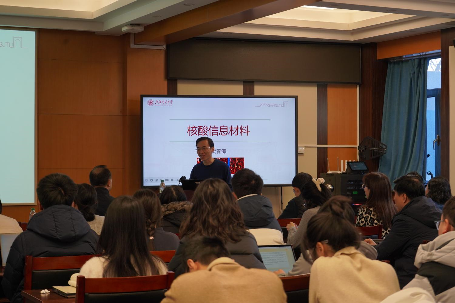 12月3日上午,“治学修身”京师大讲堂第三十九讲暨杏坛大讲堂第十八讲在化学学院化学楼二楼会议室举行。中国科学院院士,上海交通大学王宽诚讲席教授,博士生导师,化学化工学院院长、转化医学研究院执行院长、国家转化医学科学中心唐仲英首席科学家樊春海作题为“核酸信息材料”的主题报告。本次报告会由党委学生工作部、化学学院共同主办,化学学院院长毛兰群主持。