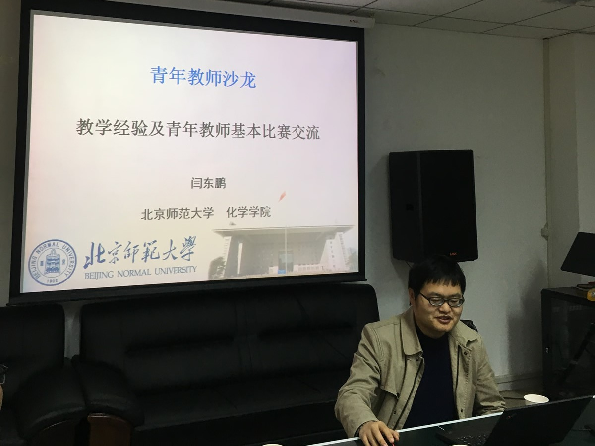 闫东鹏教授2014年3月入职北京师范大学化学学院,2018年获得国家自然科学基金优秀青年基金,2018年获得北京师范大学青年教师教学基本功比赛本科理工组一等奖。闫东鹏老师结合自身在教学方面的经验以及参加青年教学基本功比赛的经历,做了题为“教学经验及青年教师基本功比赛交流”的主题报告,报告深入浅出,内容丰富详实。闫老师以一个青年教师的角度,给大家详细介绍了青年教师在教学工作中对已有经验的传承和前沿研究的发展,以及在准备青年教师基本功比赛中的经验技巧和注意事项,引起了在做青年教师的极大兴趣。随后,闫东鹏老师与在座的青年教师进行了热烈的讨论并就相关问题进行了深入的交流。