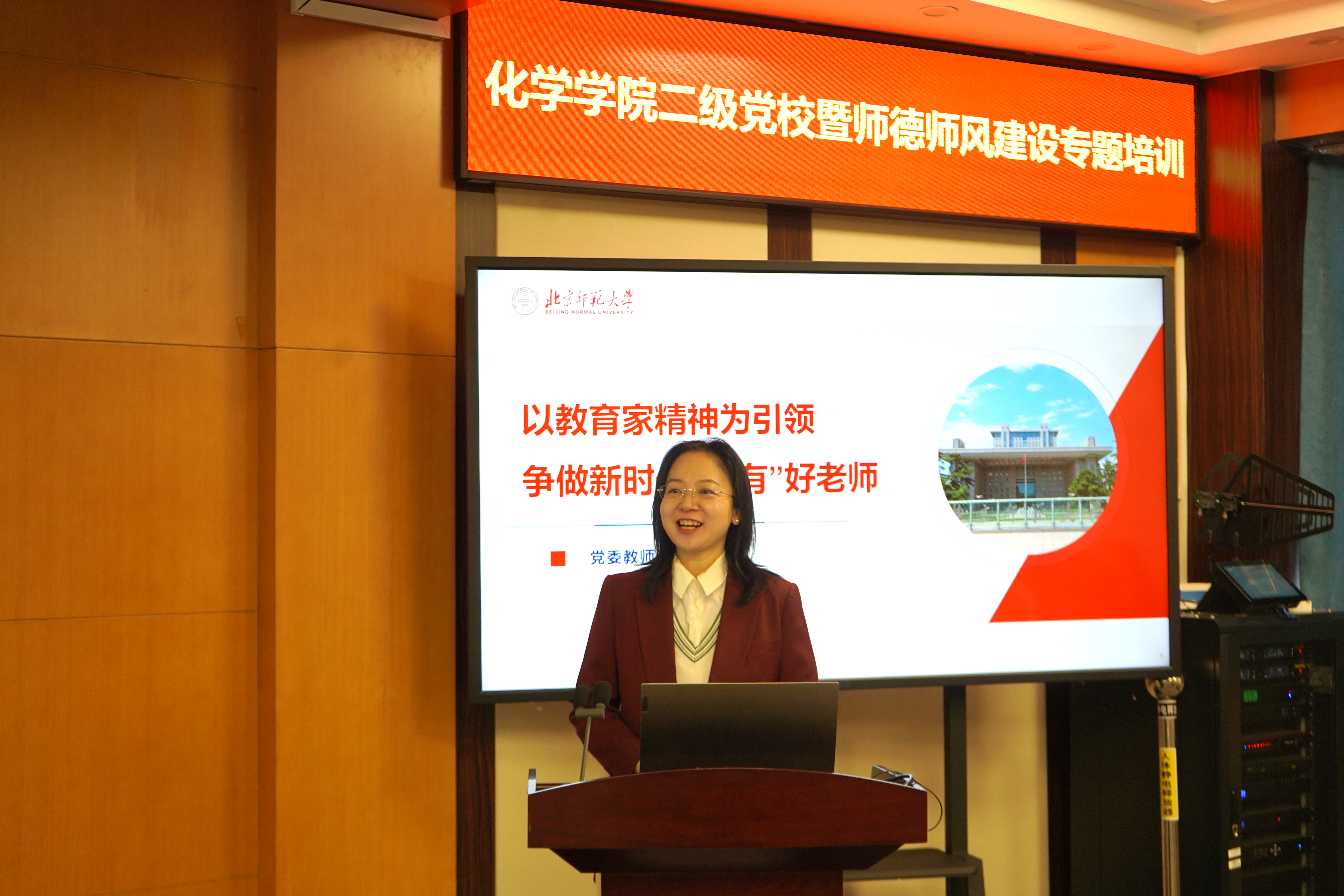2026年1月4日,化学学院在二楼会议室举办二级党校暨师德师风建设专题培训。此次培训主题为“弘扬教育家精神,担当立德树人使命”,旨在深入学习贯彻全国教育大会精神,扎实推进学院师德师风与课程思政建设。会上,理论及计算光化学教学团队“黄全国高校黄大年式教师团队”正式揭牌,党委教师工作部部长袁慧老师、教育学部檀传宝教授受邀作专题讲座。会议由化学学院党委书记杨钊主持,化学学院全体教师参加。