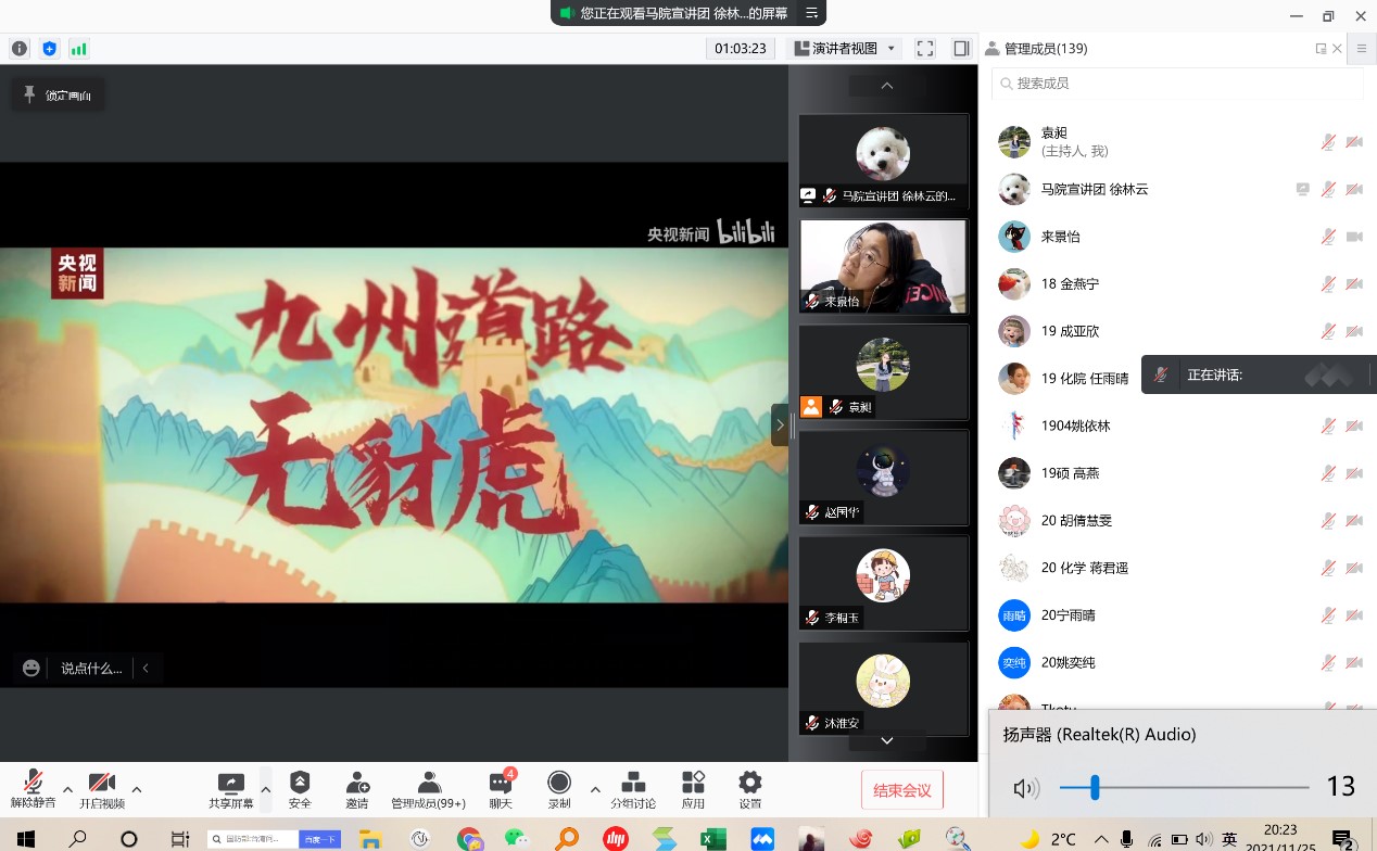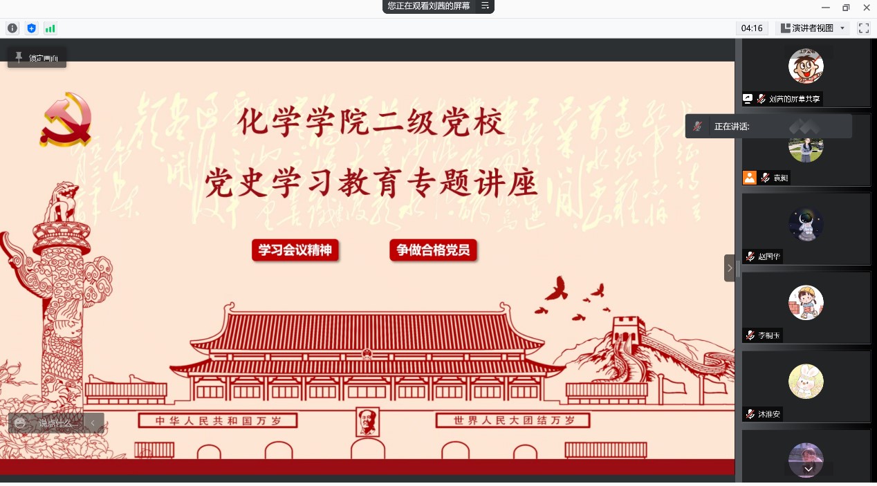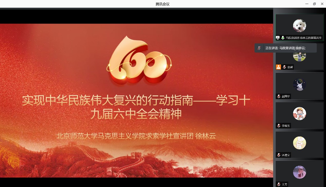2021年11月25日晚19:30,化学学院二级党校邀请马克思主义学院宣讲团成员徐林云同学作主题为“实现中华民族伟大复兴的行动指南——学习十九届六中全会精神”的专题报告,报告通过腾讯会议平台进行,2021级博士生党支部书记刘茜主持,我院党建组织员徐娜老师、袁昶老师和130余名党员代表共同参加了本次讲座。