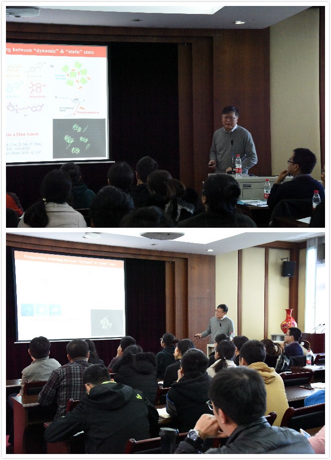 2018年11月22日,华东理工大学田禾院士莅临我院讲学。讲座主要关于分子动态组装与性能调控,制备用于调谐发射颜色的人工动态组装系统方面的最新进展。田禾院士课题组通过一个创新策略,将磷修饰到β-CD来构建无金属的非晶室温磷光(RTP)小分子化合物,这些衍生物具有强烈的RTP发光,该方法具有制备简便、可行性好、通用性强、毒性低、发光强度高、对脱氧和低温无严格要求的优点。另外,田禾院士课题组还发展了一种类似人工肌肉的分子致动器,通过外界刺激,可以实现其线性收缩和伸展运动,并在单分子尺度可逆地控制附近金纳米颗粒的距离,分子的运动同时伴随着由金纳米粒子等离子体共振产生的光信号输出。在提问交流过程中,就师生感兴趣的问题,田禾院士分子对动态组装与性能调控做了概括与解释,田禾院士认为超分子自组装是材料科学中自下而上构建有序纳米结构的有效策略,在生物学应用中已经显示出巨大的潜力。