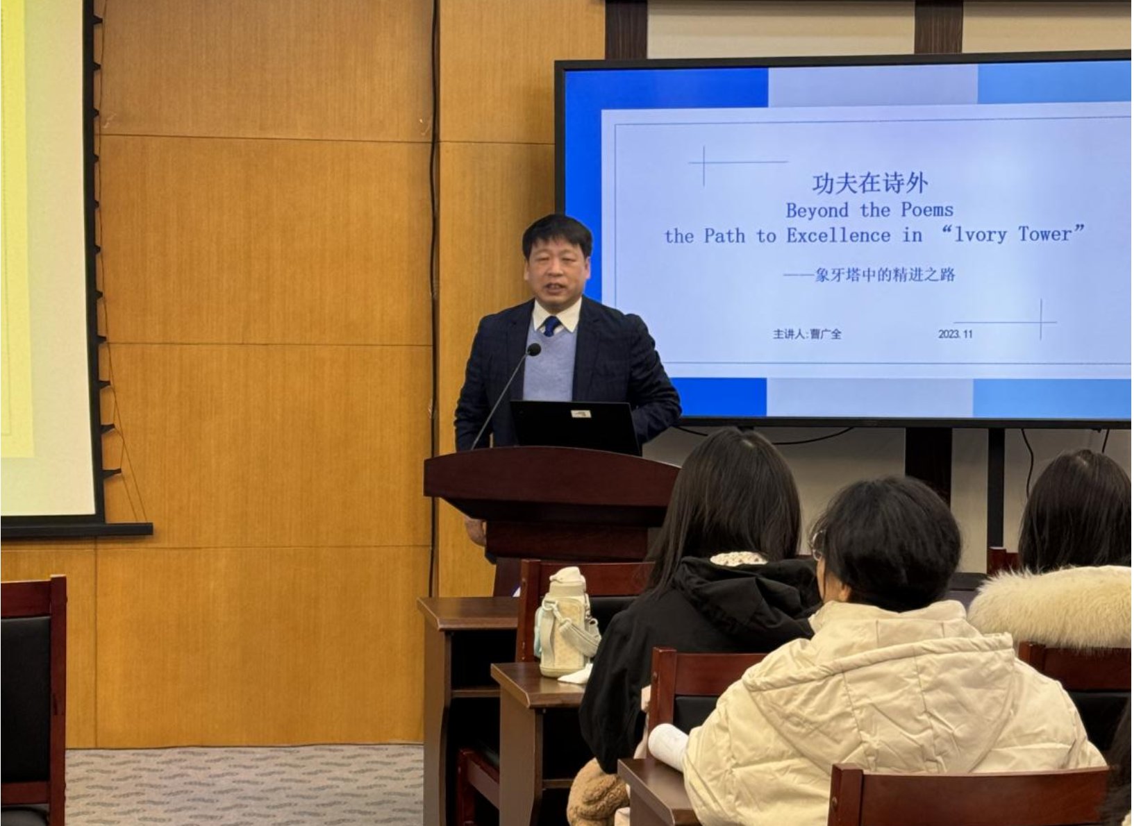 11月25日,曹广全局长为化学学院给同学们做了题为《功夫在诗外一一象牙塔中的精进之路》的职业生涯规划讲座,讲座有化学学院党委书记杨钊老师主持,近百名同学参加了本次活动。