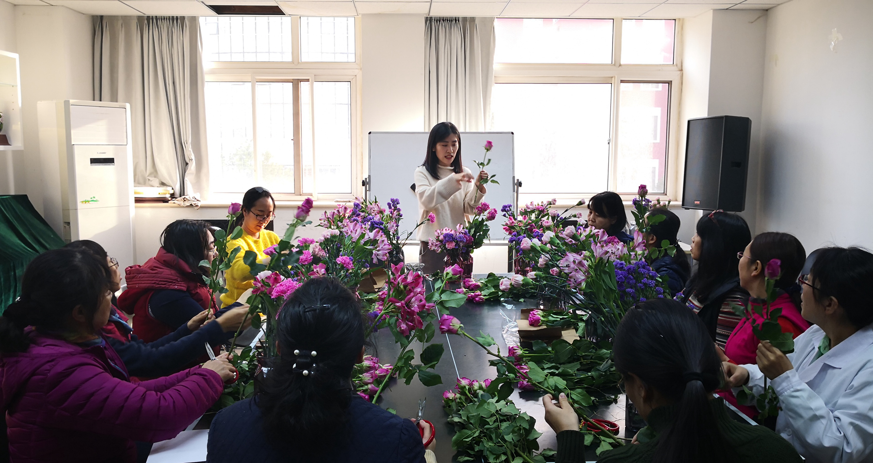 为了丰富化学学院女老师的精神文化生活、陶冶情操、提高艺术修养,2018年11月28日下午,化学学院工会组织学院女老师20余人参加了“冬之花”插花艺术讲座。此次活动专程聘请了花艺师带领大家走进插花艺术的海洋,去领略不一样的插花艺术,感受从自己手中绽放的绚烂,使女老师们在学习插花创造过程中提升了自己的审美品味。