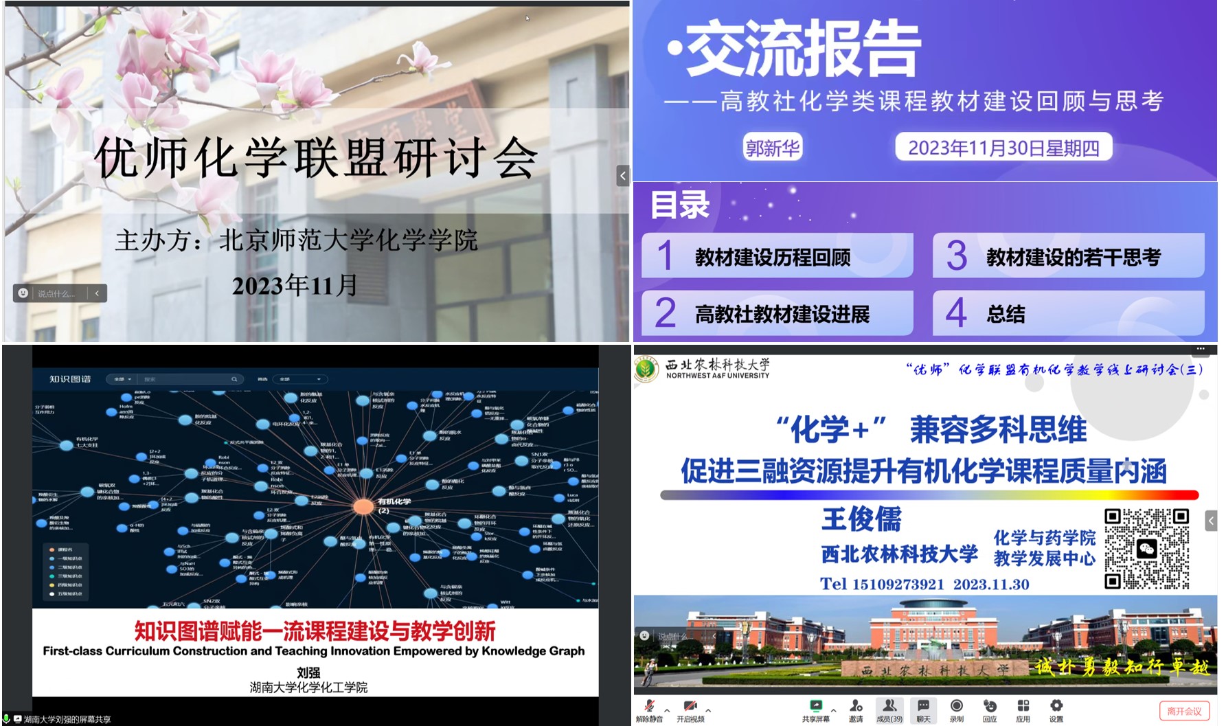 北京师范大学化学学院邢国文教授主持交流研讨环节。会议确定了共同推进有机化学数字化教学资源库和网络学习平台建设的目标。参会教师从有机化学课件优化、知识点梳理、教案和教学设计、例题与习题库建设、思政案例库建设、知识图谱等方面开展研讨。