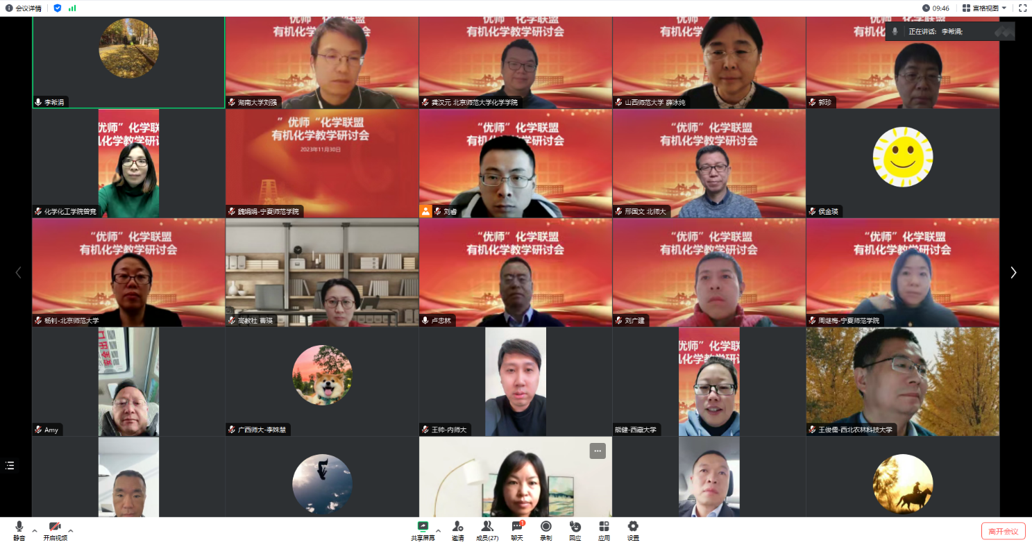 为深入探索“优师计划”化学人才培养规律,进一步提升有机化学教学质量,2023年11月30日,北京师范大学化学学院组织召开了第三期“优师”化学联盟有机化学教学线上研讨会,此次研讨会以数字化资源建设为主题。北京师范大学、青海师范大学、内蒙古师范大学、四川师范大学、宁夏师范学院、山西师范大学、西北师范大学、新疆师范大学等多所师范院校有机化学教师代表参加此次研讨活动。