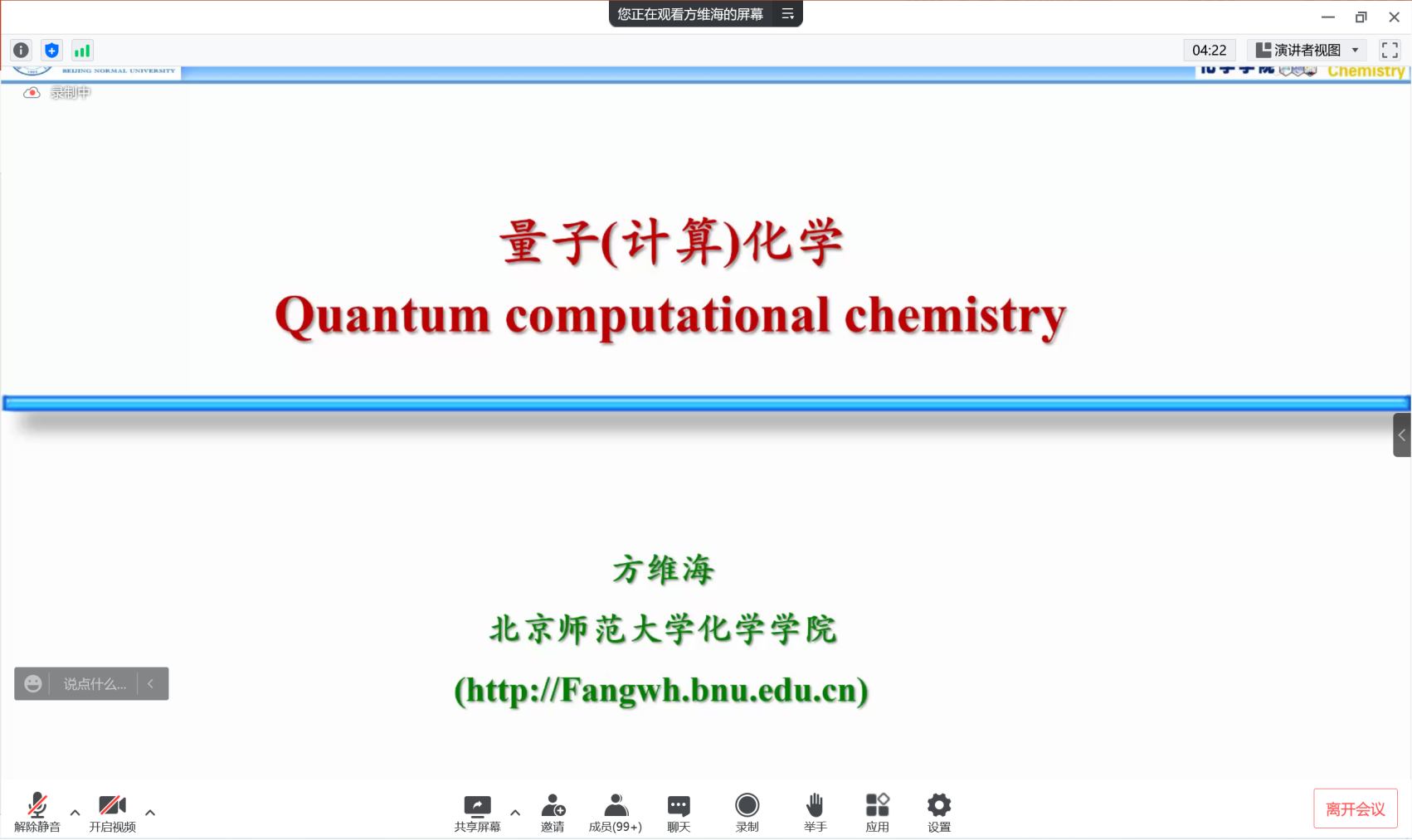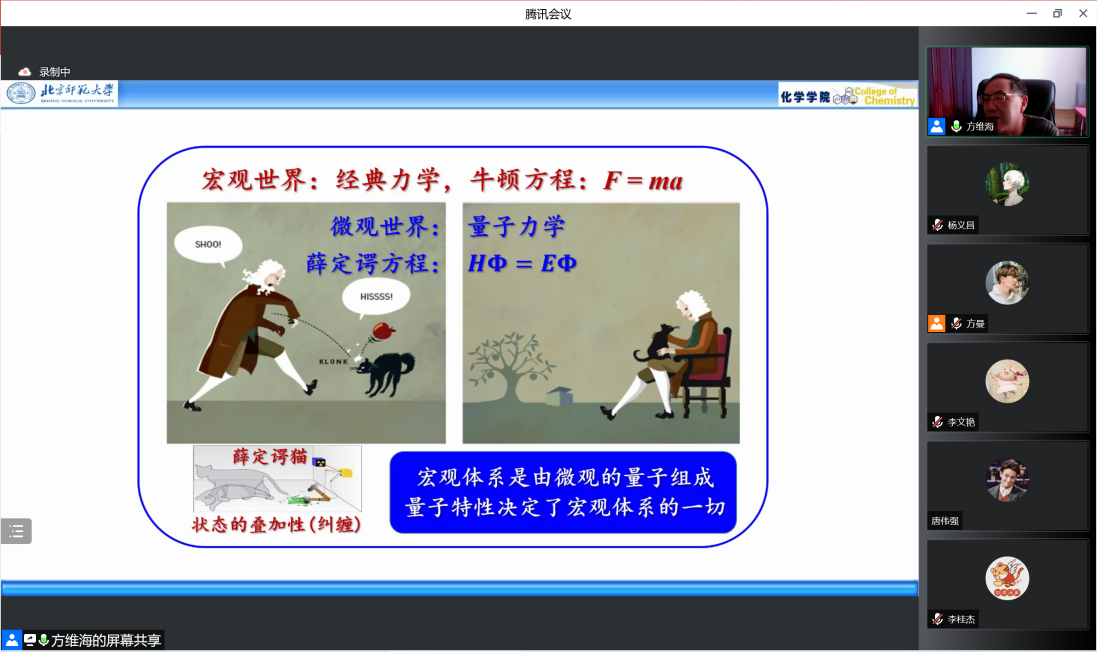 杏坛大讲堂第一讲由方维海院士主讲,杨清正副院长主持。学院教师、同学和海内外校友通过腾讯会议线上参与了本次讲座。方维海院士以“量子(计算)化学”为主题作学术报告,深入浅出地介绍了量子计算的基本原理和发展历程,并结合实际的量子化学课题,比如氢分子等小分子的解离过程、顺反异构的过渡态分析等,讲解了量子计算在量子化学领域的应用方向及技术特征,充分彰显了量子计算化学的魅力,进一步揭示了量子计算这一“未来技术”的光明前景。