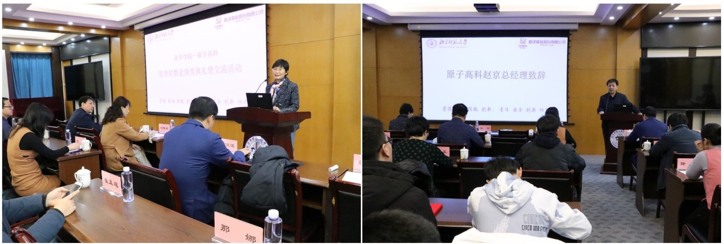 2020年12月21日上午,中核工业集团有限公司子公司中国同辐原子高科股份有限公司赵京总经理、隋艳颖副总经理等莅临化学学院,参加化学学院原子高科奖学奖教金颁奖典礼和学术交流活动,活动共分为两个阶段,颁奖典礼由学院党委副书记韩娟主持,交流活动由学院副院长张俊波主持,活动在化学楼二楼会议室举行。化学学院院长范楼珍、副院长张俊波、学院放射性药物研究团队教师等热情接待了原子高科股份有限公司的领导和专家,并参加了上述活动。