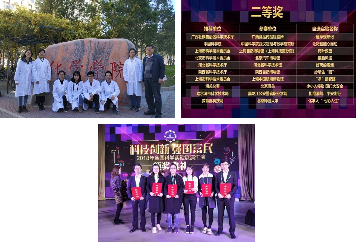 10月30日,由中国科学院科学传播局、科技部政策法规与监督司主办,以“科技创新,强国富民”为主题的2018年全国科学实验展演汇演在中科院物理所举行,来自全国35个参赛单位的96组科学实验展演团队齐聚北京,为公众呈现了一场生动有趣、精妙绝伦的科学表演盛宴,该展演汇演宗旨在于深入贯彻党的十九大精神,弘扬科学精神,普及科学知识,助力科技强国梦。北京师范大学参赛团队——孙根班课题组和卢忠林课题组联合组成科普团队,以“化学人——七彩人生”为参赛节目,将化学与材料学科交叉领域的学术成果与趣味化学实验相结合,既体现了当前化学领域和材料领域的研究前沿和热点,也表现出了极具观赏性的实验现象。该团队由北师大科技处推荐,教育部科技司进行初选,最终拿到进入决赛的资格。该团队经过一个多月的周密筹备与紧张排练,个人简介VCR制作,在10月30和10月31日两天的激烈角逐最终从专业科普表演队伍中脱颖而出,荣获2018年全国科学实验汇演展演大赛二等奖。据了解,本次比赛共设置10项一等奖,20项二等奖,30项三等奖,其余为优秀奖。