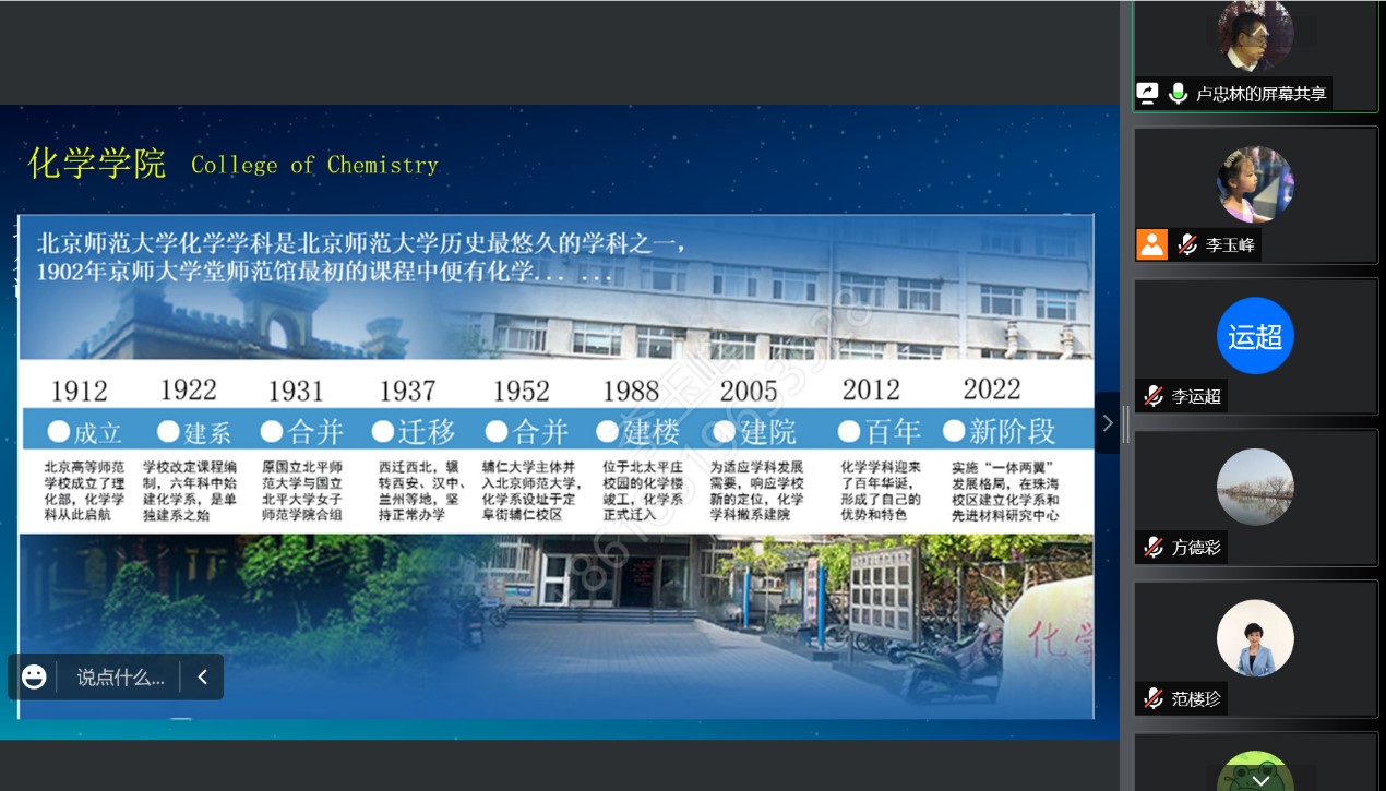 12月30日,化学学院联合珠海校区化学系及先进材料研究中心成功举办了2022京师青年学者化学学科分论坛。本次化学学科分论坛是以线上会议形式召开,化学学院党政领导、教授委员会委员、学术委员会委员、珠海校区化学学科负责人、以及14位来自国内外知名高校的优秀青年学者出席论坛。受邀参会的14位青年学者是从80余名论坛报名人中精心挑选出来的青年才俊,他们不仅科研成果突出,而且研究方向契合北师大化学学科发展的需要。