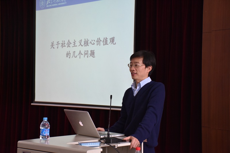 吴向东教授做了题为《关于社会主义核心价值观的几个问题》的专题报告,报告主要从“为什么要提出社会主义核心价值观?”“如何看待核心价值观的基本内容”及“如何培育和践行社会主义核心价值观”三个方面展开,介绍了价值观对于一个国家,社会,个人的重要性;各种价值观的演变形成和哲学思考;社会主义价值观的不同层面及其相互关系;强调培育和践行社会主义核心价值观,最重要的是将核心价值观融入国家治理体系和治理能力的建设,正确处理社会主义核心价值观与中国传统文化的关系。参会的师生党员们在吴教授的引导下深入理解了社会主义核心价值观的具体内涵,希望今后能运用自己的知识、智慧、理性和热情去服务于国家和社会,做合格党员。