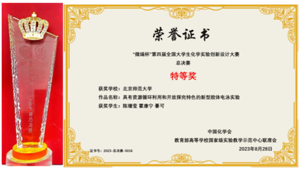 陈珊莹团队的改进实验作品“具有资源循环利用和开放探究特色的新型胶体电泳实验”,凭借巧妙的创意和精彩的阐释在总决赛中斩获特等奖。截至目前,在已举办的四届全国大学生化学实验创新设计大赛总决赛中,我院代表队已三获特等奖殊荣,总体成绩突出。本次大赛不仅是对参赛同学的一次锻炼、一次成长、一次收获,也为推动我院实验教学改革、提升我院本科生的创新意识、创新热情、实践能力,提供了有利的契机。