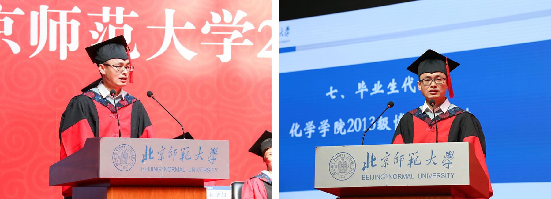 我院范楼珍教授的博士毕业生、2013级博士生袁方龙同学作为毕业生代表发言。他表达了对母校培养、老师关怀和亲友陪伴的感谢,结合自己在北师大的五年研究生学习时光,分享了自己在母校学到的“三种精神”:锲而不舍的坚持精神、求真求实的创新精神、敢于追梦的时代精神。他号召所有毕业生不忘初心、砥砺前行,为中华民族伟大复兴中国梦的实现贡献北师大学子的一份力量。