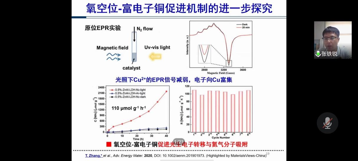 最后,在答疑环节,老师同学们积极参与,就电催化固氮、深入光催化加氢等问题与张铁锐研究员进行了热烈的互动,张铁锐研究员就这些问题进行了详细的解答。