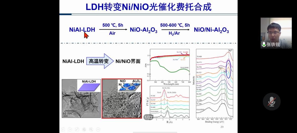张铁锐研究员简单介绍水滑石的结构及其光催化的机理后,重点介绍了引入表面缺陷结构提高催化活性和优化设计界面结构提高催化选择性等。