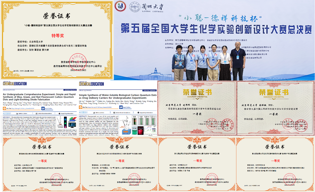化学学院始终高度重视实验教学改革,致力于夯实学生的实验基本功并激发其创新活力,积极推动本科生参与实验开发与创新实践,并在多项重要赛事中屡获佳绩。2025年7月,学院四支代表队在第五届全国大学生化学实验创新设计大赛华北赛区竞赛中包揽新创实验、改进实验、科普实验和数智化实验四个赛道的一等奖。同期,两名本科生在第九届全国高等师范院校大学生化学实验邀请赛(操作赛)中双双斩获一等奖
