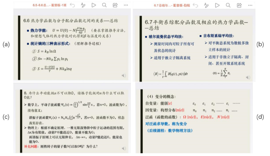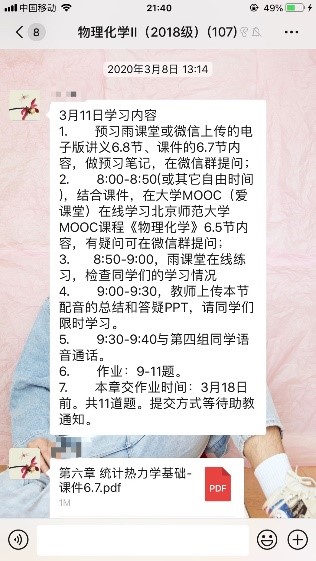 2020年新春伊始,一场突如其来的疫情打破了常规的课程计划。为响应学校提出的“延期开学不停课,多元教学保质量”的倡议,化学学院“物理化学”教学团队经过精心部署与准备,于2月24日如期开始2019-2020学年春季学期“物理化学Ⅱ”的远程在线授课。物理化学课程因涉及较多的物理概念和数学推导,被学生认为是最难的一门专业必修课,为了调动学生的学习热情知难而上、并达到传统课堂的学习效果,教师团队综合设计了包括课前预习、课上观看MOOC视频、实时在线练习、教师答疑、课后反思提问等多环节和活动的复合式教学方案,并借助中国大学MOOC、长江雨课堂、微信群等多个网络平台与工具,探索了以MOOC授课为基础、以学生学习为中心、以教师辅导为支撑的物理化学远程教学。以难中之难的“统计热力学”为开篇章节,三周的教学实践表明,这种教学方式能够激发学生主动学习的兴趣,培养学生的自学能力,提高学生的思辨和创新能力。