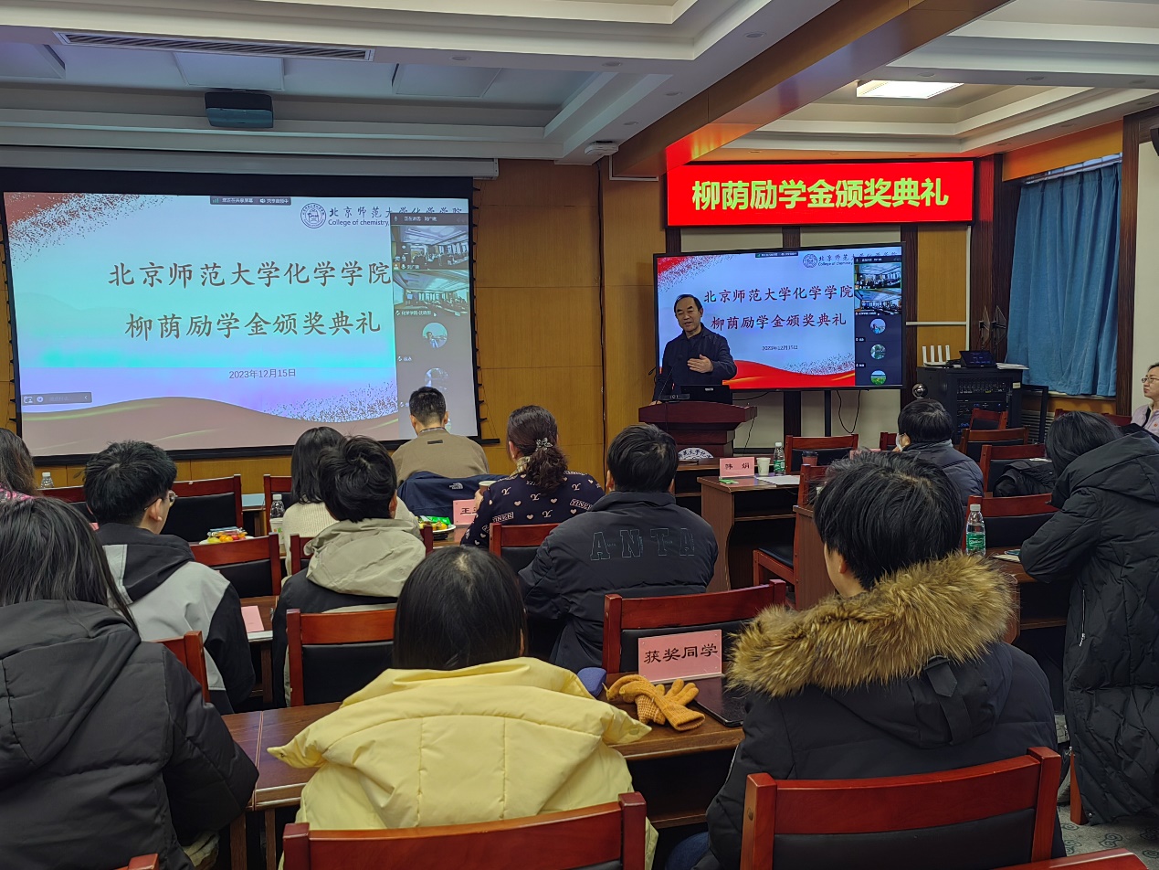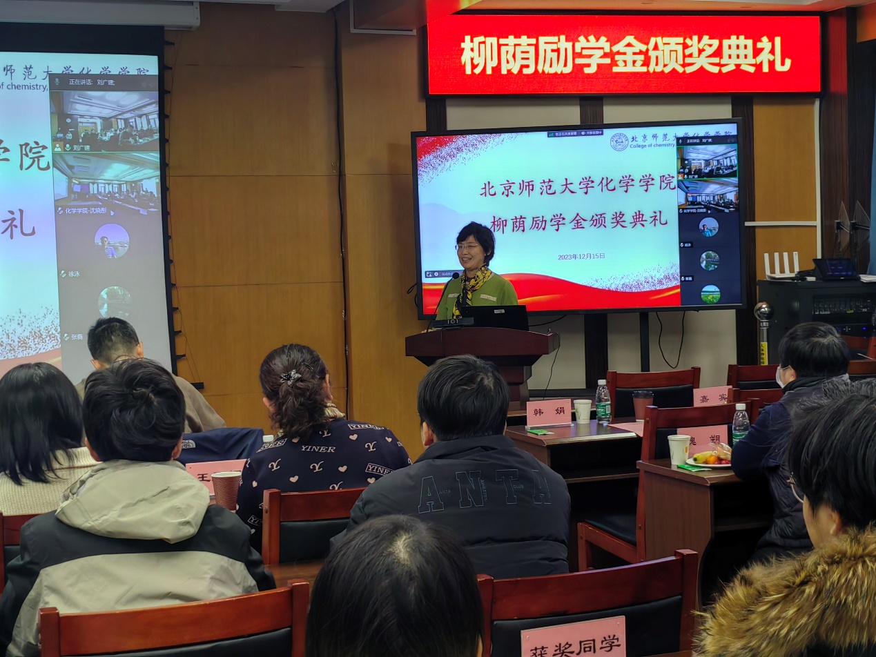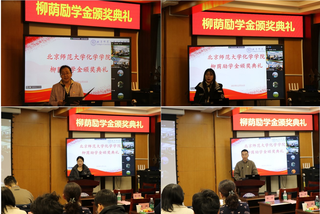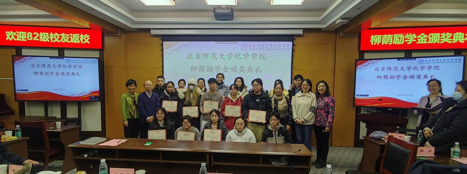 2023年12月15日,北京师范大学化学学院在化学楼二楼会议室隆重举行2023年“柳荫励学金”颁奖典礼。北京师范大学校友总会副秘书长樊哲、化学学院院长毛兰群、副院长魏朔、1982级校友代表和获奖学生等参加了颁奖典礼。典礼由化学学院党委副书记韩娟主持。