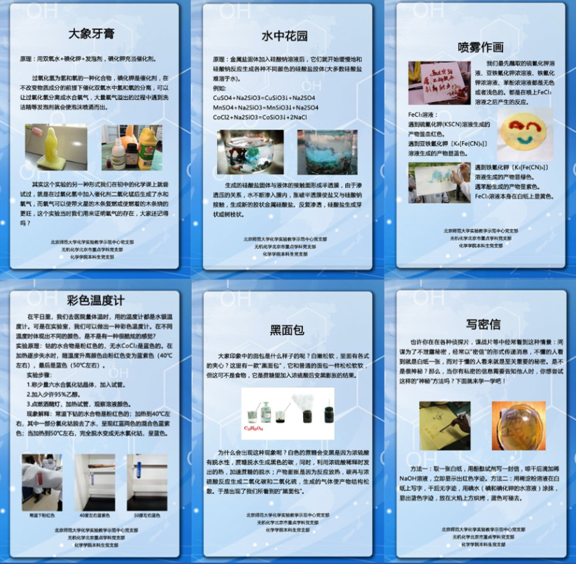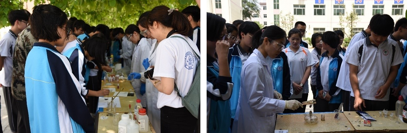 北京师范大学化学学院本科生党支部的同学们还结合化学专业特色,在容城中学教学楼前进行了“水中花园”、“大象牙膏”、“喷雾作画”、“彩色温度计”、“黑面包”、“写密信”等多项趣味化学实验展示,这些实验项目受到了中学生们的喜爱,学生之间也通过生动活泼的形式进行了化学科普的交流与讨论,激发了中学生学习钻研化学的兴趣。