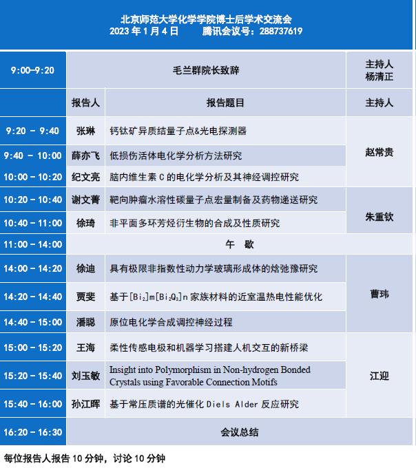 为响应党的二十大提出的教育科技人才三位一体支撑国家高质量创新发展的号召,加快推进学校一流学科建设和学院的发展,2023年伊始,化学学院举行一系列的学术论坛交流活动。1月4日,北京师范大学化学学院2023年度博士后学术交流会在线举办。中国科学院院士方维海、北京师范大学人事处处长王洛忠、化学学院院长毛兰群、党委书记卢忠林以及化学学院的一百余位师生参加了此次学术交流会。
