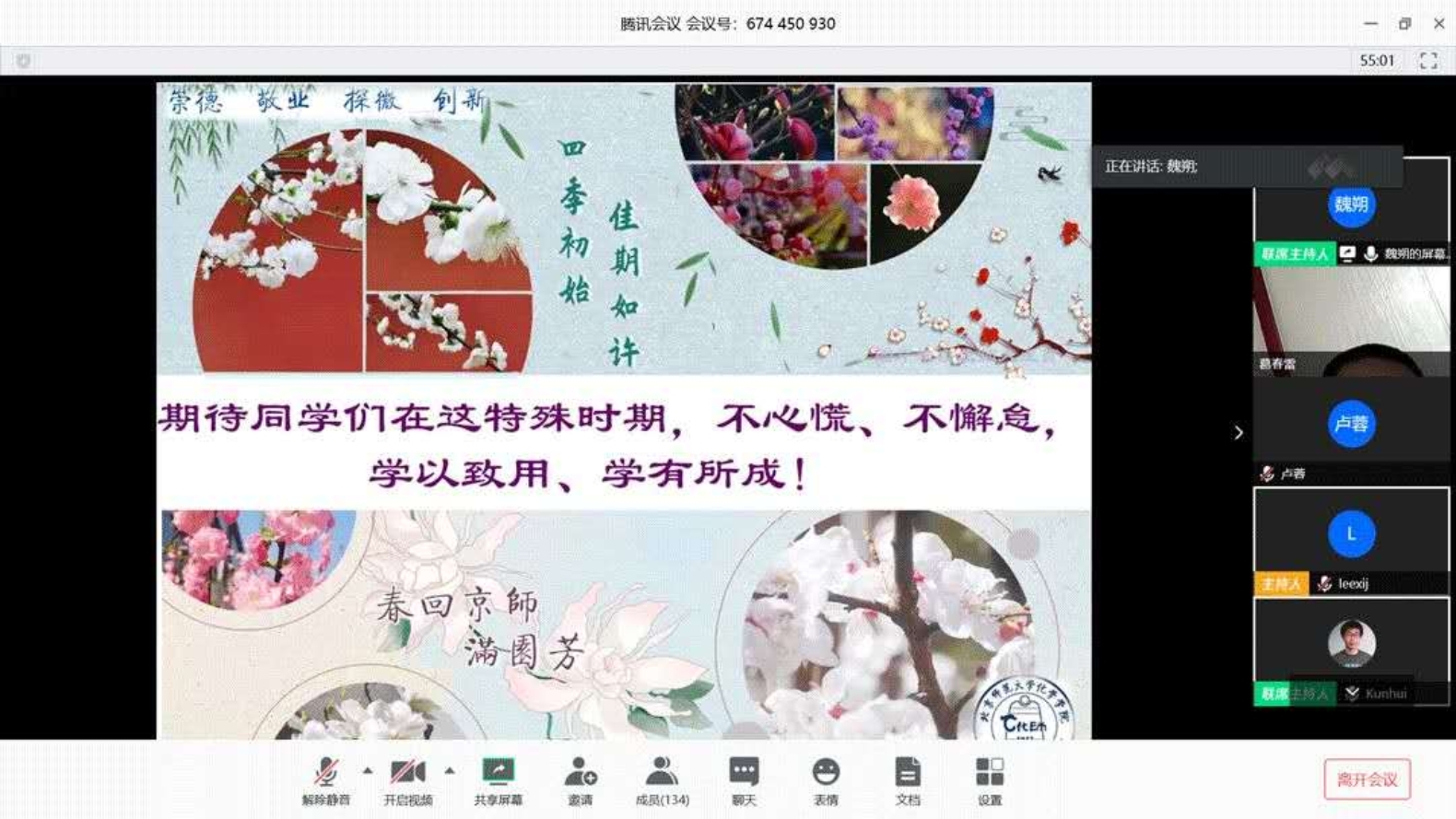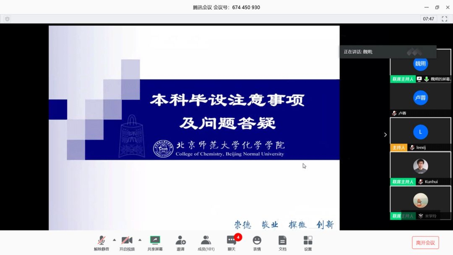 2020年4月1日下午,化学学院副院长魏朔老师通过腾讯会议为2016级本科生开展"本科毕设注意事项及问题答疑"的讲座。2016级本科生及班主任参加讲座。