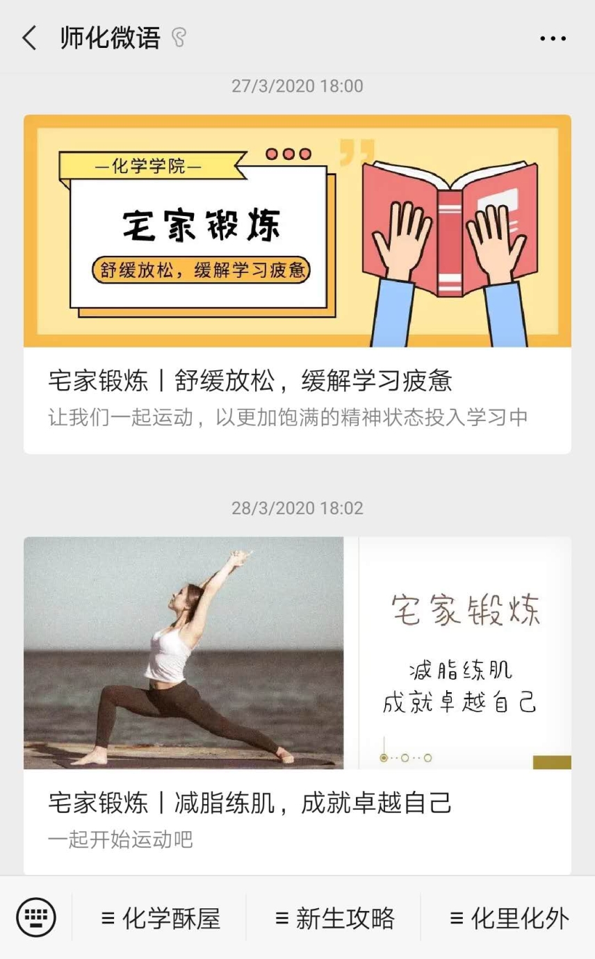 并基于网课学习模式的缺点,呼吁长时间盯着屏幕的同学们进行适当的锻炼,学生会还推出了系列宅家锻炼的推送,包括舒缓放松、减脂练肌、徒手塑形等。