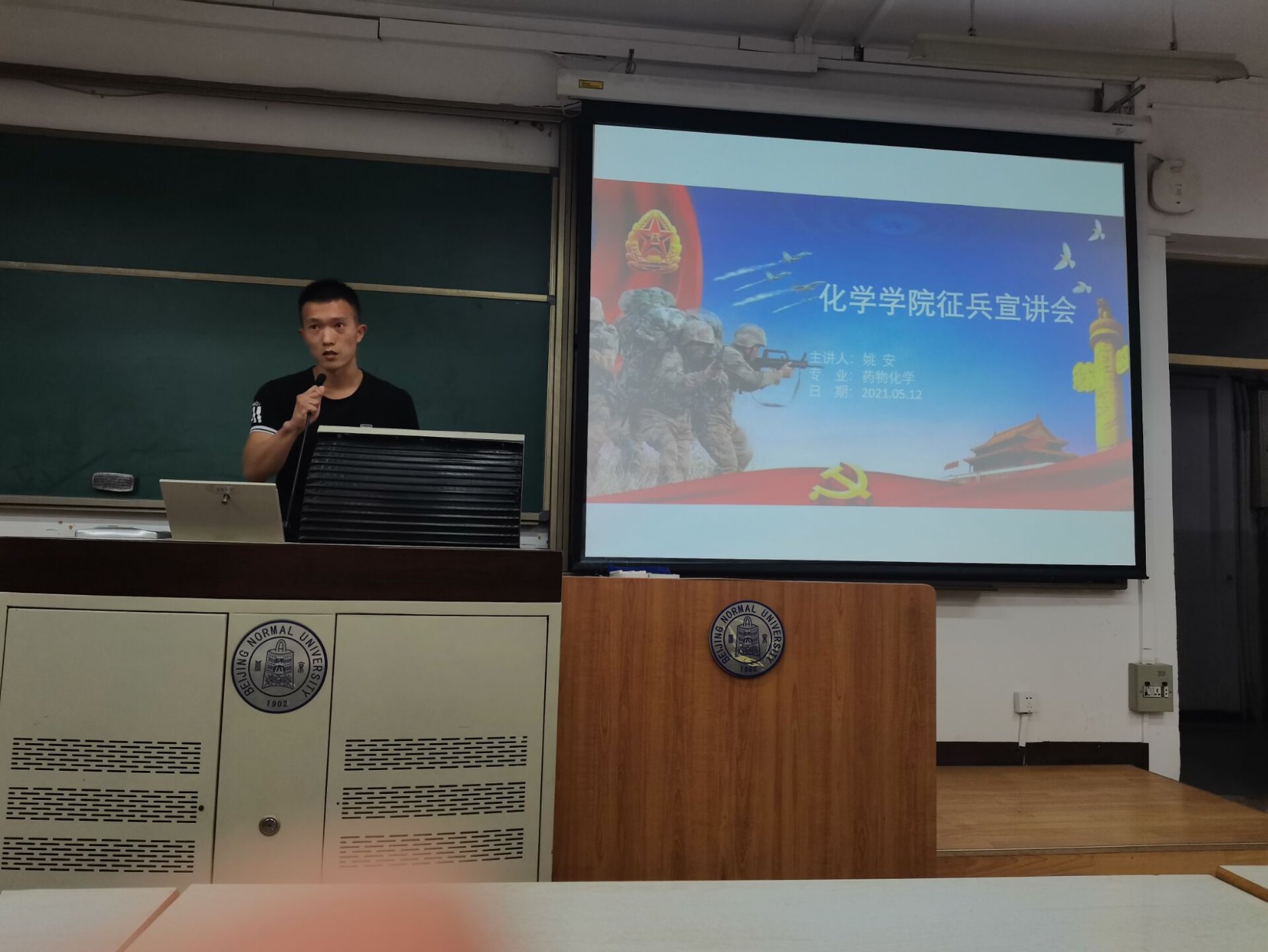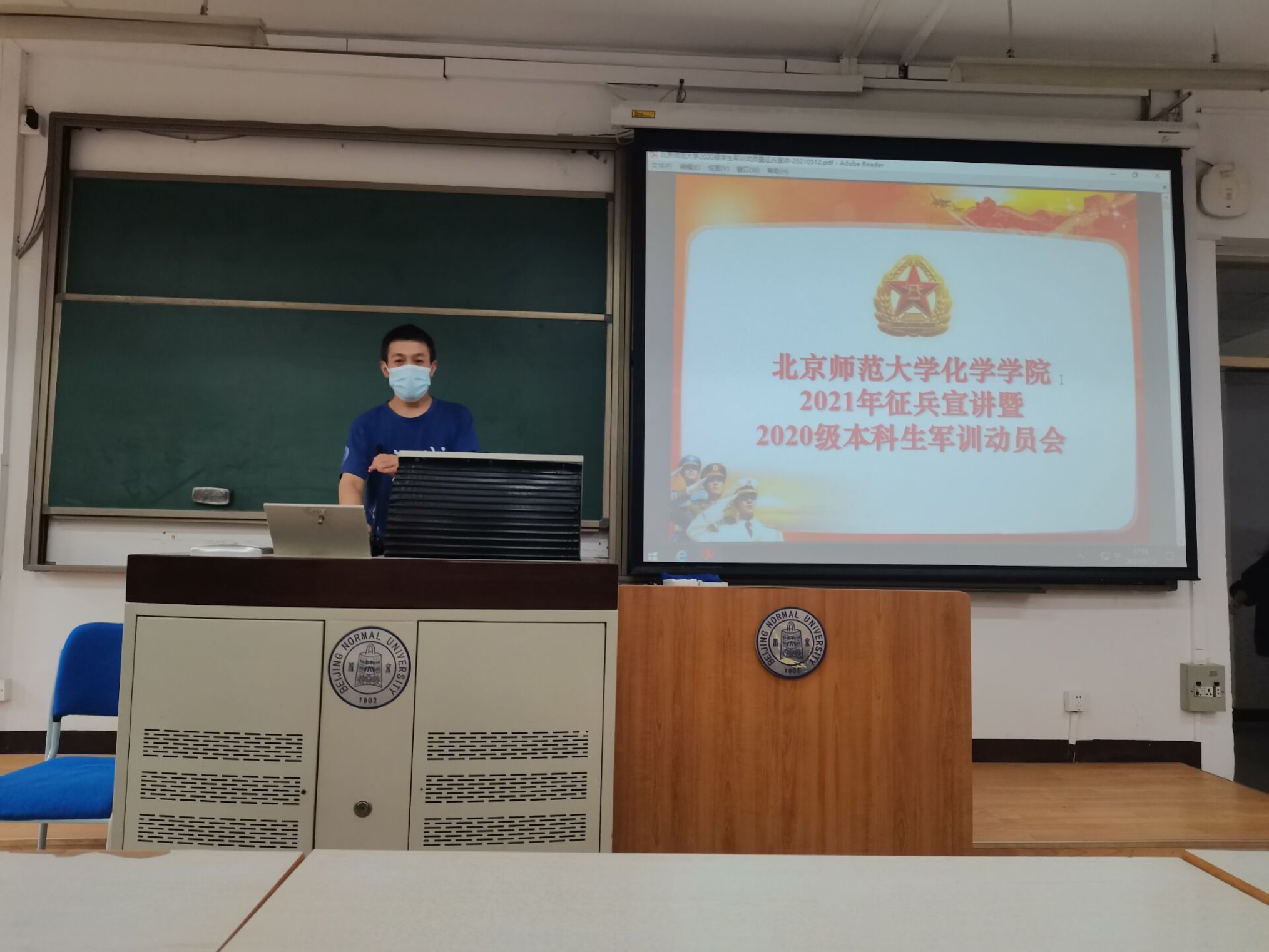 2021年5月12日晚5:50,化学学院2021年征兵宣讲暨2020级本科生军训动员会在教二楼208教室召开,会议由刘广建老师主持,化学学院2020级同学参加会议。