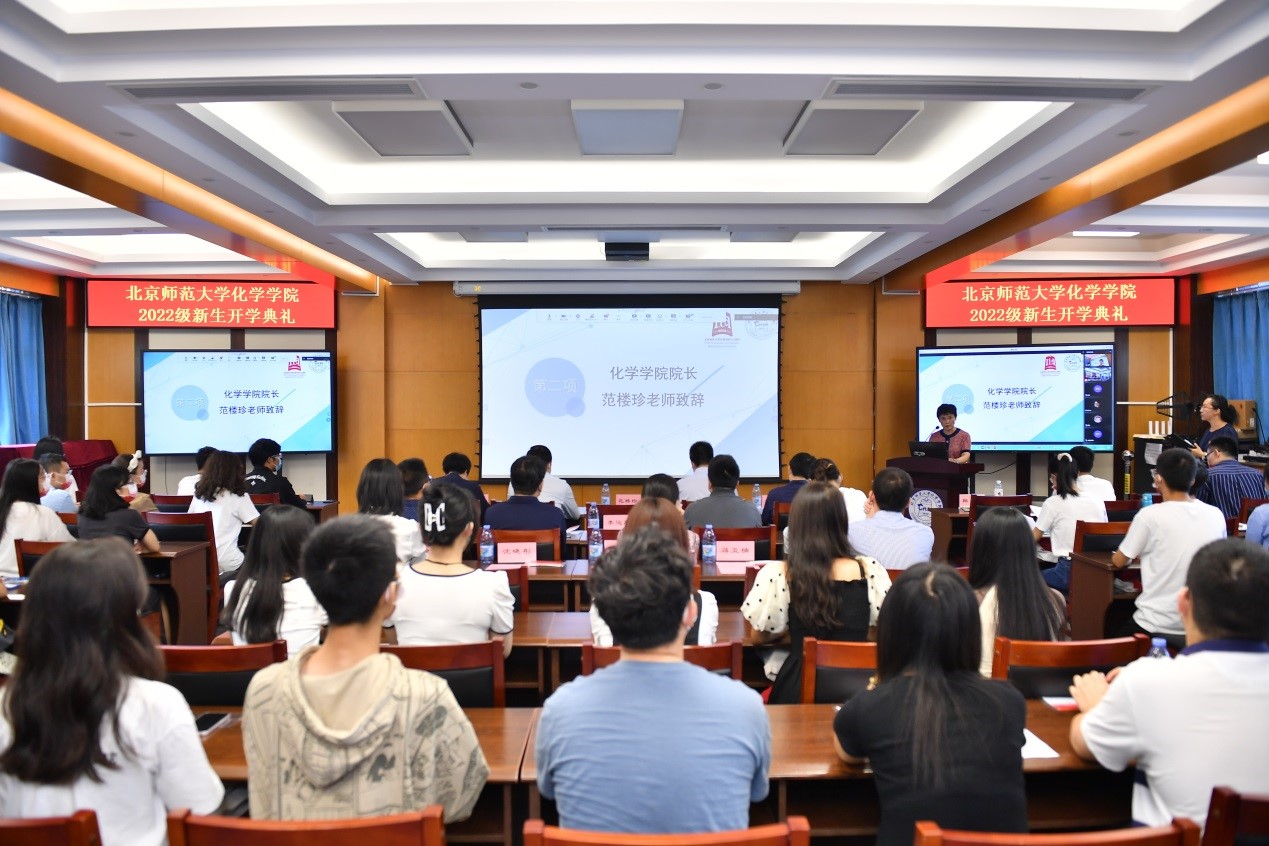 首先,范楼珍院长致辞,表达了对2022级新生的欢迎和祝贺。在北师大120周年华诞以及化学学科成立110周年之际,范老师向同学们分享了教师节对自己的特殊意义,介绍化学学院学科发展、人才培养情况,建立了一个特色鲜明、优势显著的学科。范老师向同学们分享2020届杨然同学的学习经历,鼓励新生们培养自主学习、独立思考的能力。勉励大家要刻苦努力、积极向上,学有所成、全面发展。