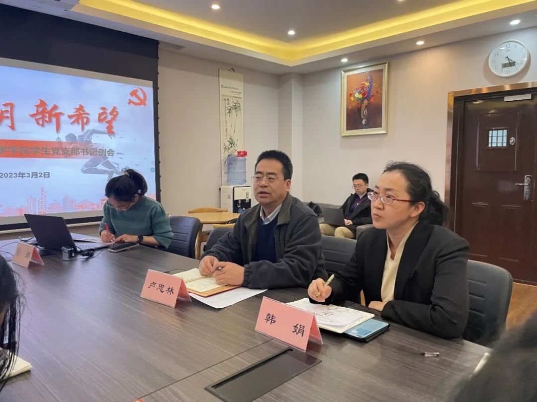 会议以“新学期、新希望”为主题,为2023年春季学期的学生党建工作进行发展规划。学院党委书记卢忠林老师发表讲话,表示学院十分认可各个学生党支部的工作,特别肯定了基层组织建设方面的工作。卢老师对新学期的党建工作提出三点希望:一是希望新的学期能够开发支部活力、增加更多的实践活动,并与专业结合达到更好的学习效果;二是希望学生党支部能积极接触教师支部,促进师生间的交流;三是希望北京校区和珠海校区能够协作举办活动。另外,卢老师建议各支部书记充分利用化学教育和企业方向的校友资源,实现本院师生和优秀校友的互惠共赢。