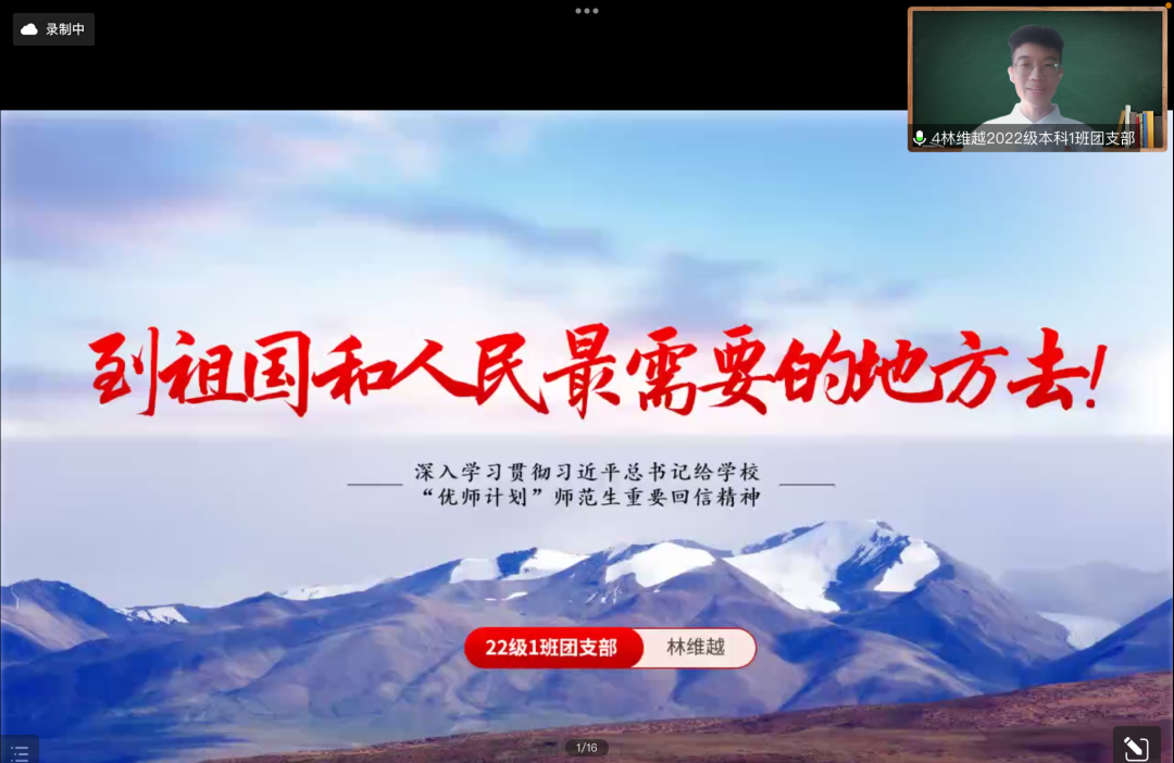 我是化学学院2022级本科1班团支部的团支书林维越,今天我要讲的微团课主题是“深入学习贯彻习近平总书记给学校‘优师计划’师范生重要回信精神”。