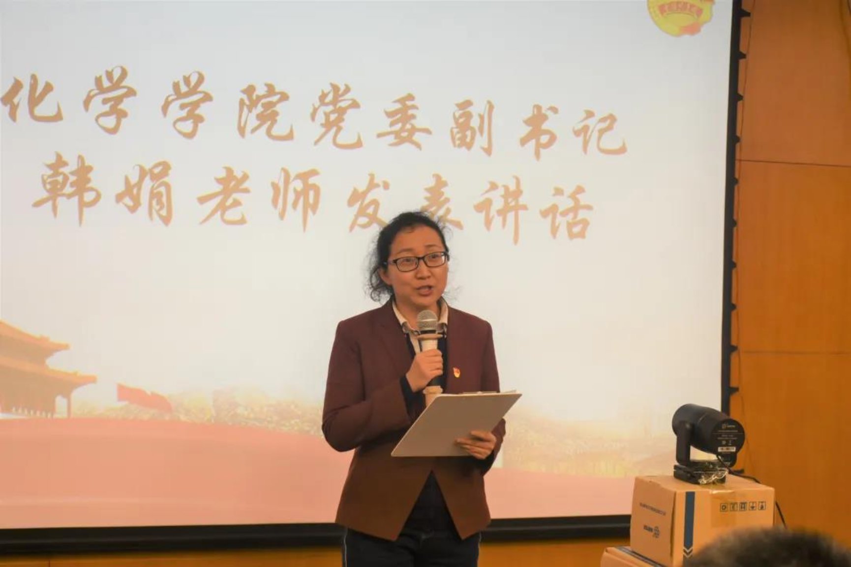在热烈的掌声中,化学学院党委副书记韩娟老师为同学们介绍了微团课大赛的意义,并对同学们未来的发展提出了期望。她指出:微团课大赛就是为同学们提供的一个舞台,通过丰富多彩的形式,以身边的“小切口”展现引领国家和党团的“大视角”,并借此激励更多青年人不忘初心、牢记使命,在新时代长征路上矢志奋斗、砥砺前行。