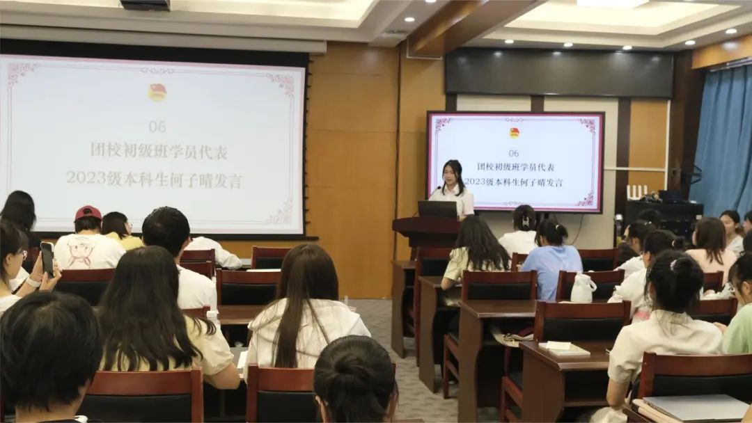 接着,化学学院2023级本科新生代表何子晴同学发言。何子晴同学立足时代潮流发展,分享了她对青年团校的认识。她认为参加青年团校可以提高学员思想觉悟,增强团组织凝聚力,从而成长为信念坚定、刻苦学习、勤奋工作、自觉奉献的时代新青年。她鼓励同学们积极进取、磨练意志,提升思想、锻炼能力,于时代大潮中明使命、勇担当,怀一颗永不褪色的赤子心。