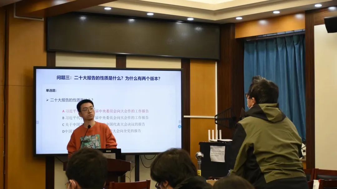 张经纬同学采用问答的形式,阐述了二十大报告的性质。此外,张经纬同学还向我们讲解了除了书面报告以外还要增加口头报告的原因,以及口头报告缩减的方法,让同学们对二十大有了更为深入的了解。